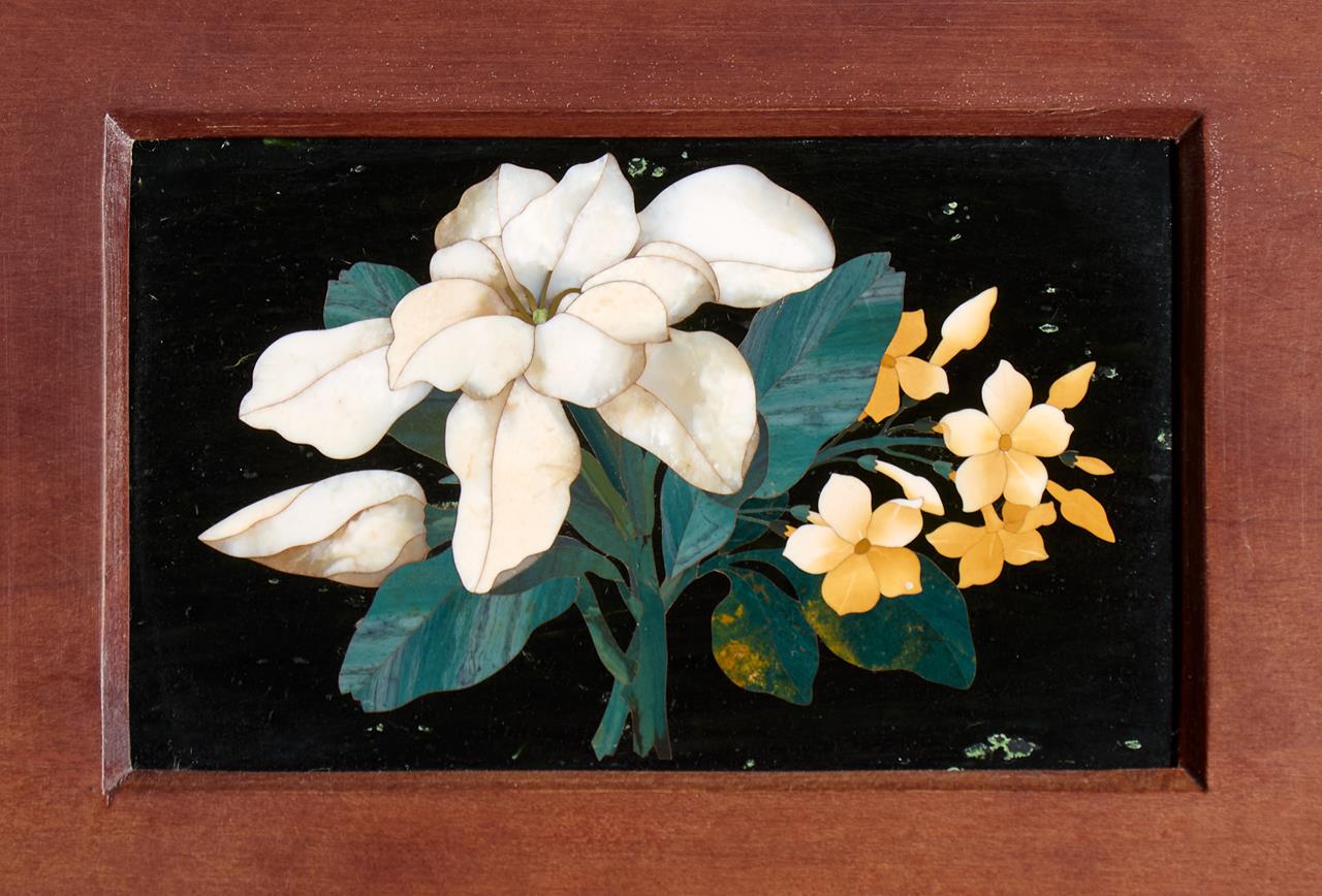 Formella rettangolare in commesso di diaspro e calcedonio di Volterra, diaspro di Sicilia su fondo di nefrite. La decorazione è costituita da un grande fiore espanso circondato da rigogliose foglie ed intrecciato ad un mazzetto di fiori più piccoli che richiamano i ranuncoli
