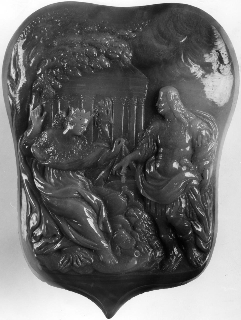 Rilievo a forma di stemma eseguito in calcedonio dei Grigioni. Appoggiata al tronco di un albero fronzuto la Toscana, incoronata ed avviluppata in panno sontuosi, si mostra lusingata di ricevere il Granduca Cosimo III, in piedi davanti a lei, con armatura all’antica, avvolto in un ampio mantello. Sullo sfondo, a rilievo molto schiacciato, il Tempio della Pace, una classica facciata di tempietto greco con al centro la statua della dea