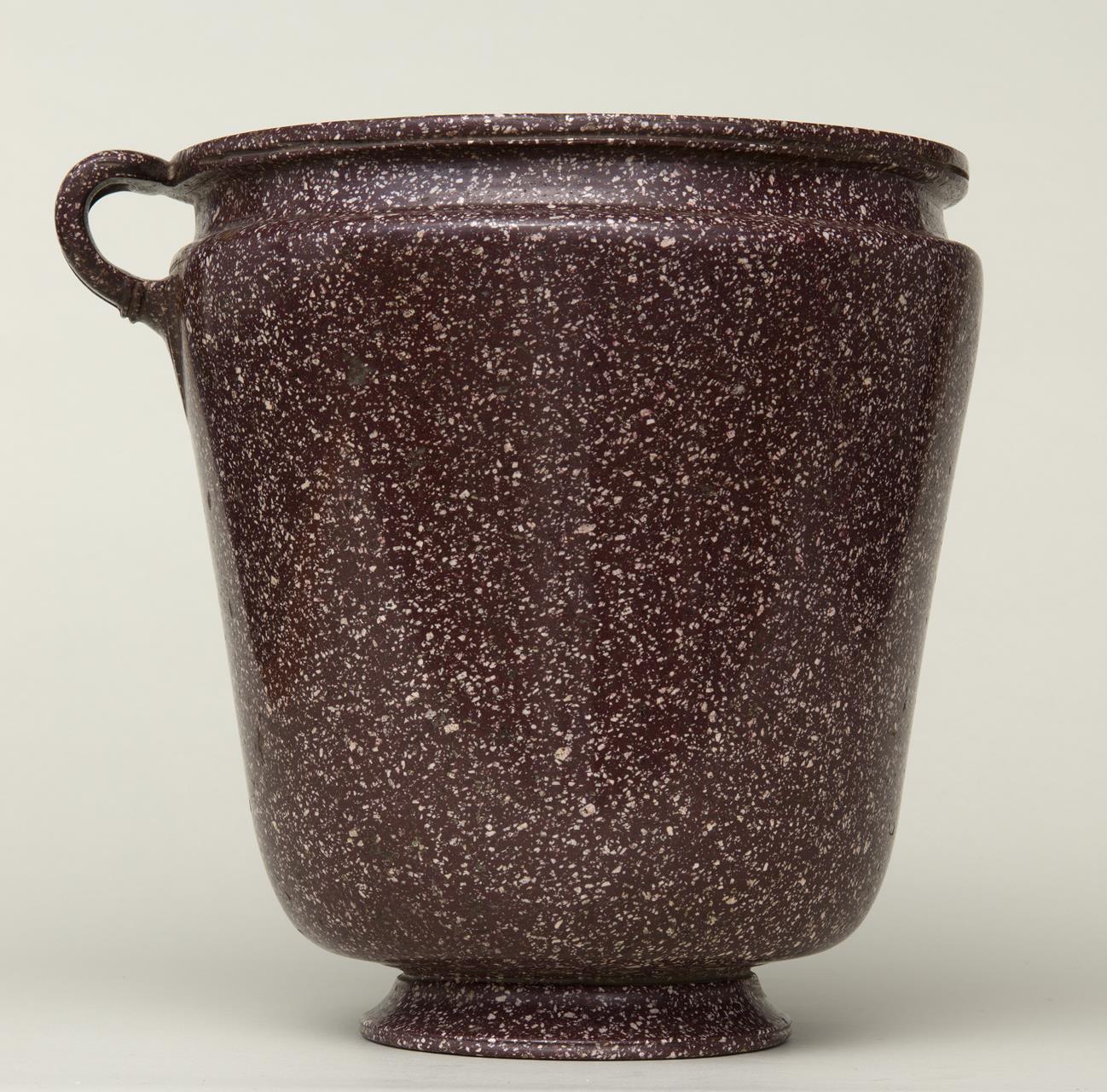Grande vaso monoansato eseguito in porfido rosso antico. Mostra una breve base circolare ed un grande corpo, a sviluppo tronco-conico, con leggera sagomatura alla bocca da cui parte una breve ansa