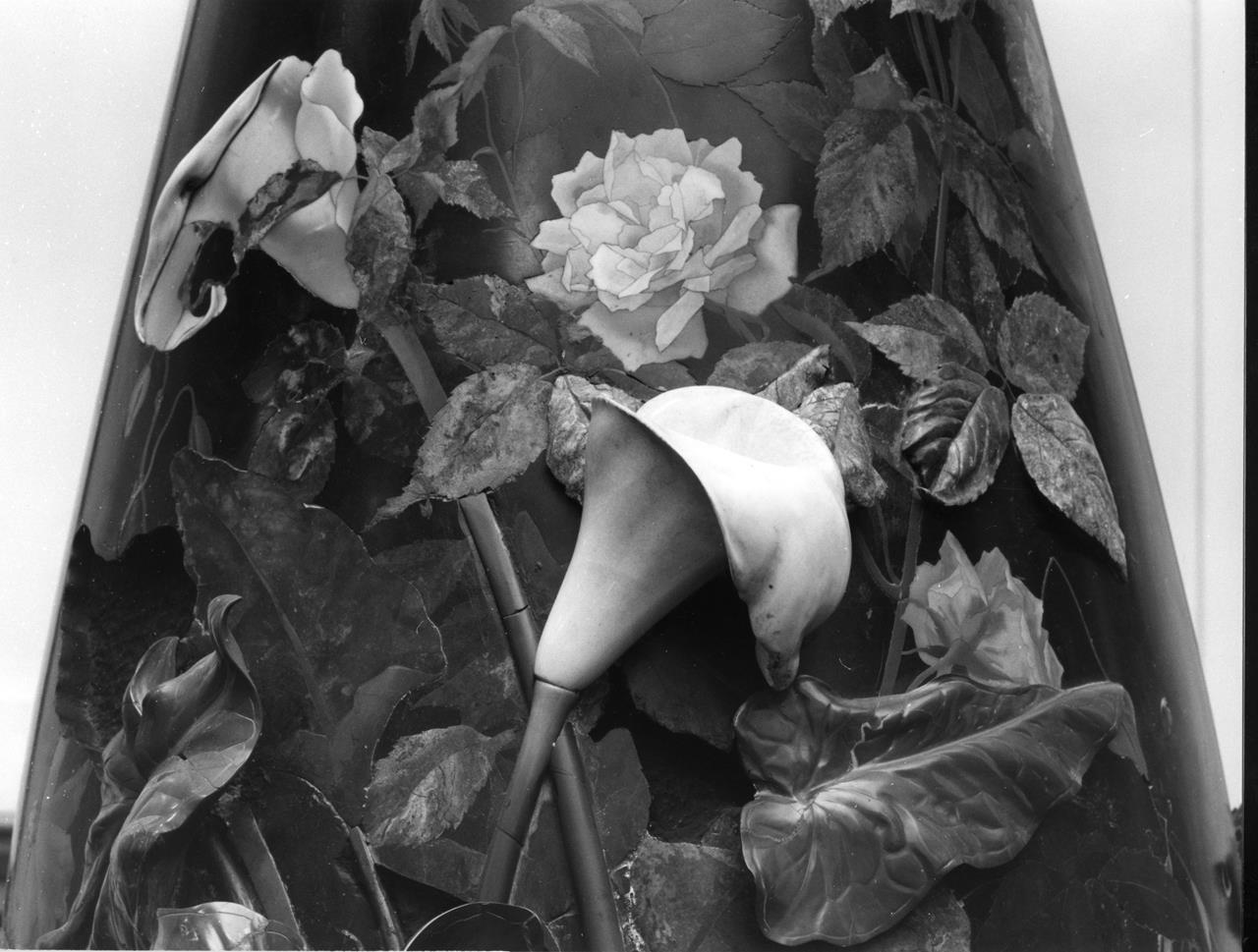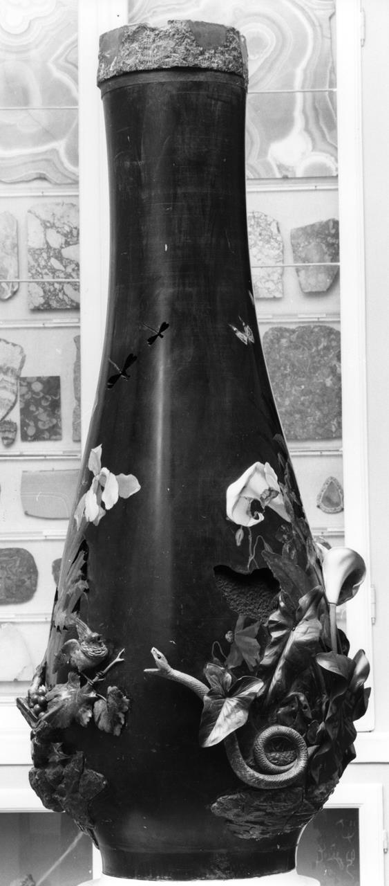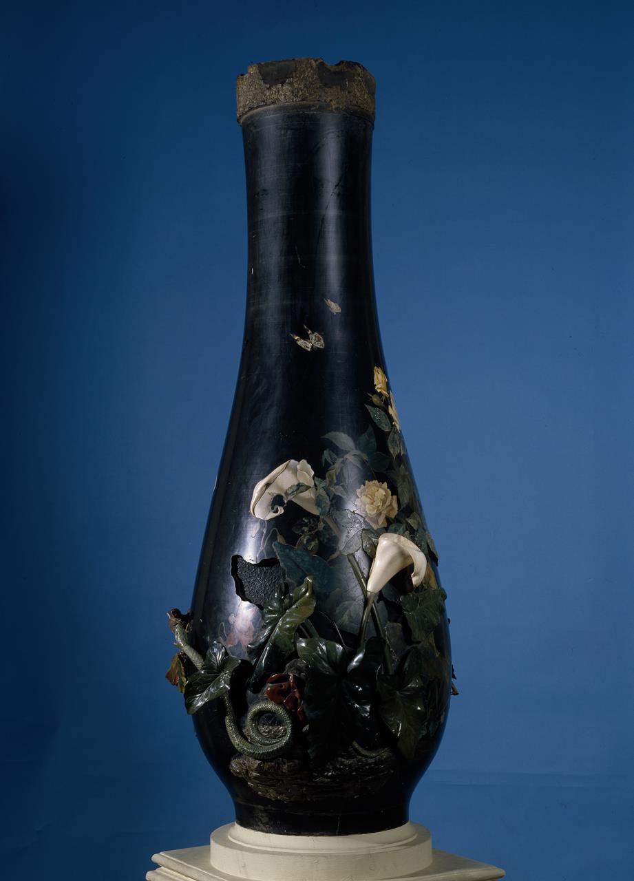 Grande vaso in marmo nero del Belgio con lavori in commesso di pietre dure e a rilievo: vi compaiono diaspri di Volterra, Sicilia, d’Arno, d’Alsazia, di Boemia e Rapolano sanguigno, ametista, agate di Goa, legno silicizzato, cristallo di rocca, calcedonio di Volterra, del Casentino e dei Grigioni. Di forma rotondeggiante che va assottigliandosi nel collo, presenta un complesso e raffinato commesso di fiori, calle, rose, iris, decorato da folto fogliame su cui svolazzano farfalle. Il lavoro a rilievo è altrettanto articolato, con frutta, pampini e racemi che includono anche un uccello ed un sinuoso serpentello che sbuca sotto una lucente foglia d’edera. L’opera non è compiuta, essendo infatti priva della parte terminale a corolla di fiori, che doveva costituire la parte più caratteristica del lavoro