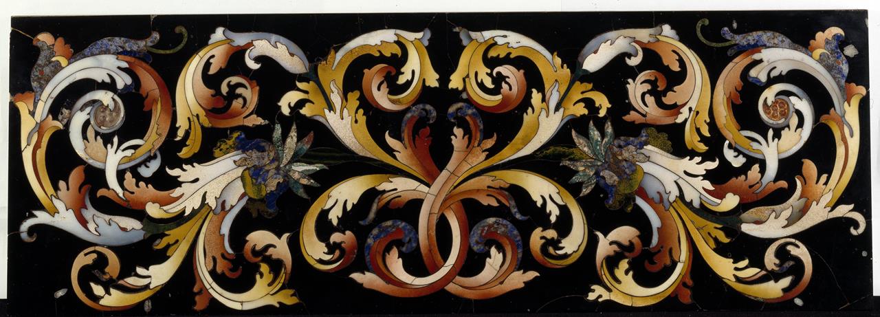 Formella rettangolare, eseguita in commesso di pietre dure su fondo di marmo nero. Presenta una ricca decorazione di cartigli con rare, simmetriche infiorescenze