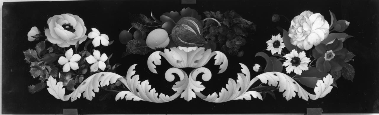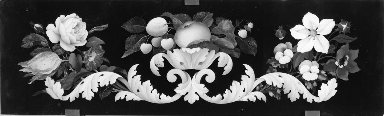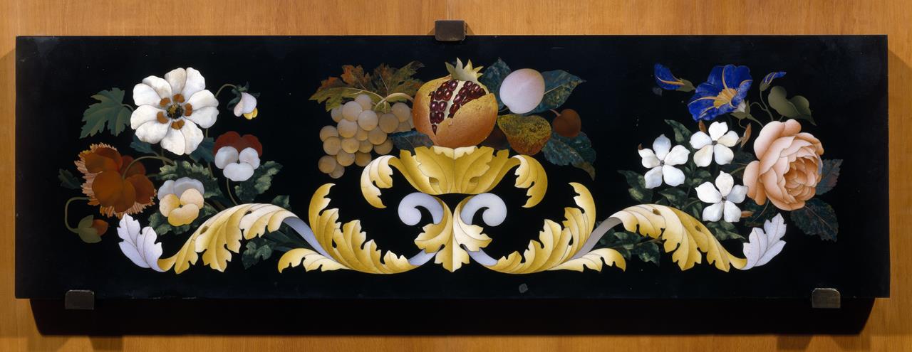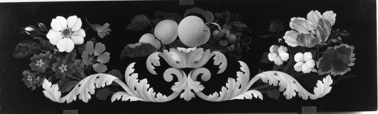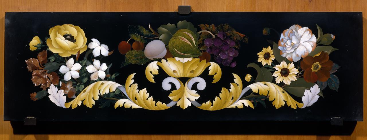 Formella rettangolare eseguita in commesso di pietre dure, diaspro di Volterra, di Sicilia, agate e lapislazzuli su fondo di paragone, raffiguranti trionfi di fiori e frutta. Grandi racemi simmetrici sostengono un trionfo di frutta (uva, ciliegie, melograno, fragole). Ai lati, sempre in posizione simmetrica, due fasci di fiori, sempre molto esuberanti, decorati da fogliame vario