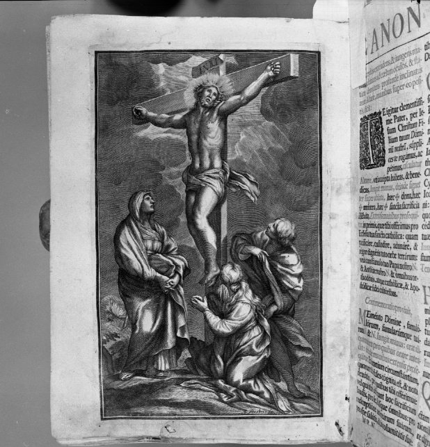 - NOTIZIE STORICO CRITICHE L'opera (p.178) reca in basso a destra il nome di Martial Desbois, incisore francese operante nella seconda metà del Seicento, che si distingue per una accurata resa disegnativa, nonostante si inserisca per la ricchezza ed esuberanza di forma nel Seicento barocco. L'incisione risulta legata a schemi compositivi più serrati e meno illanguiditi, come certe espressioni patetiche e fantasiosi movimenti, che diventano subito drammatica ricerca di un'angoscia più contenuta, più naturalisticamente studiata e umanamente sentita. Risulta così che l'opera pur appartenendo ad un messale seicentesco sembra rifarsi a schemi e motivi stilistici tardo cinquecenteschi