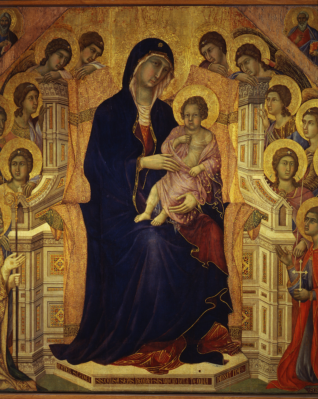 - NOTIZIE STORICO CRITICHE La Maestà di Duccio di Buoninsegna fu eseguita per l'altare maggiore del Duomo di Siena tra il 1308 e il 1311. La grande pala d'altare era dipinta su due facce e dotata di predella e coronamento, nonché sormontata da cuspidi dipinte con angeli a mezzo busto. Da alcuni documenti pubblicati nel 1898 dal Lisini e da una tavoletta di Gabella del 1483 attribuita a Pietro Francesco Orioli, risulta che sulla Maestà si trovava inoltre un complesso meccanismo in ferro e legno, corredato di tendaggi, con tre angeli in legno dipinto che scendevano a porgere al sacerdote l'ostia, il calice e il corporale, mentre altri quattro reggevano candele. Come ci informa nella sua "Cronaca" Agnolo di Tura del Grasso il 9 giugno 1311 la grande tavola venne portata in Duomo con una processione che coinvolse tutta la città. Nel tempo numerose sono state le proposte fatte dai più importanti studiosi di arte senese in merito alla ricostruzione della grande ancona, si ricordi qui Carli (1979), White (1973-1979), Deuchler (1984), a cui vale la pena aggiungere il lavoro della Gardner von Teuffel (1979) che riteneva la pala fiancheggiata e sostenuta da due pilastri laterali a sezione quadrata. Ma se la critica moderna ha prodotto una vastissima letteratura su Duccio e la sua Maestà, questo non è avvenuto in tempi più remoti. A partire dal Vasari e fino alla fine del Settecento non si hanno infatti notizie di questo capolavoro. Solo con il Della Valle e il Lanzi il nome di Duccio riappare nella letteratura artistica senese e solo con l'esposizione permanente della Maestà nel Museo dell'Opera a partire dal 1878 si da avvio ad una nuova e ampia tradizione critica legata a Duccio e alla sua opera, considerata uno dei massimi capolavori della pittura italiana su tavola di inizio Trecento. Ed ecco che risulta più chiaro il continuo peregrinare di questa grande ancona, che subì nel corso dei secoli vicende alterne. Nel 1506 fu spostata e appesa in una parete del transetto sinistro e sostituita con il ciborio bronzeo del Vecchietta, tanto che nel 1536 è infatti documentata presso l'altare di San Sebastiano. In seguito, nel 1771, la tavola fu smembrata e segata in due: la parte anteriore fu posta nella cappella di sant'Ansano, nel transetto sinistro, la parte posteriore nella cappella di san Vittore, nel transetto destro, e gli scomparti delle predelle e dei coronamenti furono collocati in sacrestia. Nel 1878 la tavola fu ricomposta, almeno per ciò che riguarda i due grandi scomparti centrali e i restanti pannelli, e collocata nel Museo dell'Opera dove tutt'ora è esposta. Nella sua collocazione originaria la Maestà era visibile da ogni lato. Sul fronte anteriore era raffigurata la Madonna in trono con il Bambino attorniata da santi e angeli, su quello posteriore si trovavano raffigurate in 26 scene le storie della Passione di Cristo. La fonte per le scene della Passione si fonda sulla lettura dei Vangeli canonici, a parte un'unica scena, quella della Discesa al Limbo, dove la fonte testuale è da identificarsi nel Vangelo apocrifo di Nicodemo. Nella predella anteriore, di cui oggi rimangono nel Museo dell'Opera cinque scene, è presentata l'infanzia di Gesù, in quella posteriore, composta solo da due scene, storie della vita pubblica di Cristo. Per quanto riguarda i coronamenti rimangono, ridimensionati rispetto alle misure originali, sei pannelli nella parte anteriore e sei nella posteriore. Il coronamento anteriore, ispirato alla Legenda Aurea di Jacopo da Varagine, presenta le storie della morte e dei funerali della Vergine; quello posteriore illustra invece storie di Cristo dopo la resurrezione. A partire dalla metà dell'Ottocento abbiamo inoltre notizie dei pannelli oggi mancanti e conservati in vari musei o collezioni private: Tentazione sul monte (Frick Collection, New York), Vocazione di Pietro e Andrea (National Gallery of Art, Washington), Cristo e la samaritana (Collezione Thyssen-Bornemisza, Madrid), Guarigione del cieco e trasfigurazione (National Gallery, Londra), Resurrezione di Lazzaro (Kimbell Art Museum, Texas), Annunciazione (National Gallery, Londra), Natività con Isaia e Ezechiele (National Gallery of Art, Washington), quattro tavolette con mezze figure d'angeli (Collezione Johnson a Philadelphia, Mount Holyoke College nel Massachusets, Collezione Stoclet a Bruxelles, Collezione J.H. van Heeck di s'Heerenbergh in Olanda)