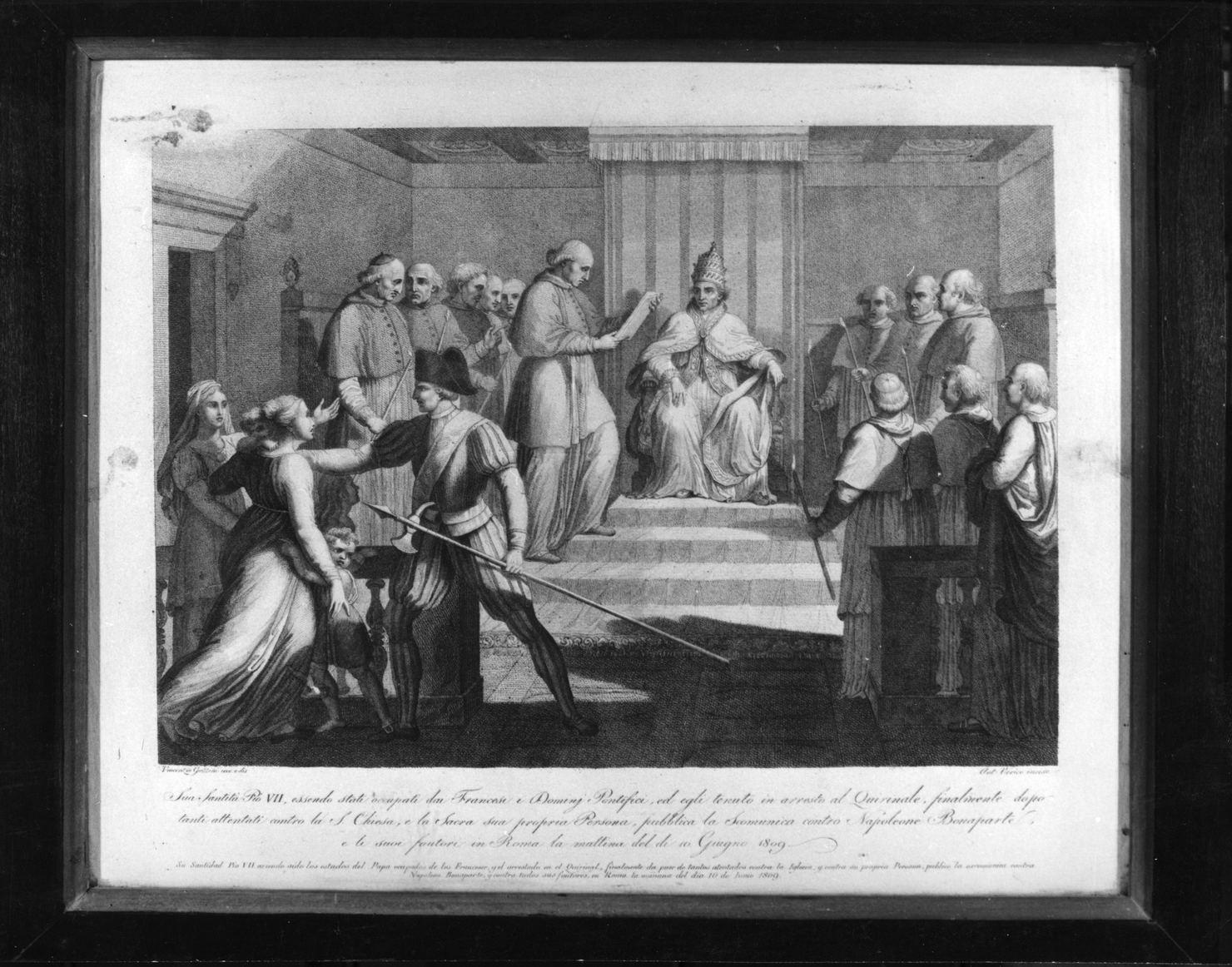 - ISCRIZIONI in basso - Sua Santità Pio VII essendo stati occupati da Francesi e Dominj Pontefici, ed egli tenuto in arresto al Quirinale finalmente dopo/ tanti attentati c ontro la S. Chiesa e la Sacra sua propria Persona pubblica la scomunica co ntro Napoleone Bonaparte/ e li suoi fautori in Roma la mattina del di 10 g iugno 1809 - corsivo -