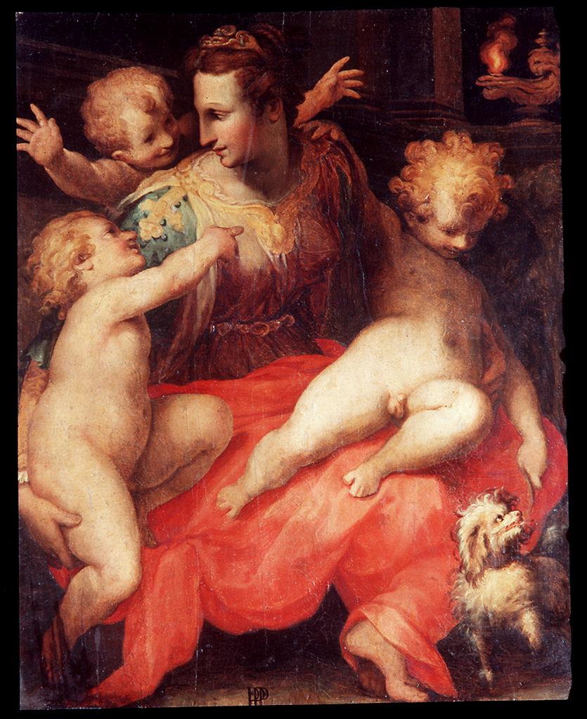 Allegorie-simboli: Carità. Figure: bambini. Attributi: (Carità) fiamma. Interno: mensola. Animali: cane