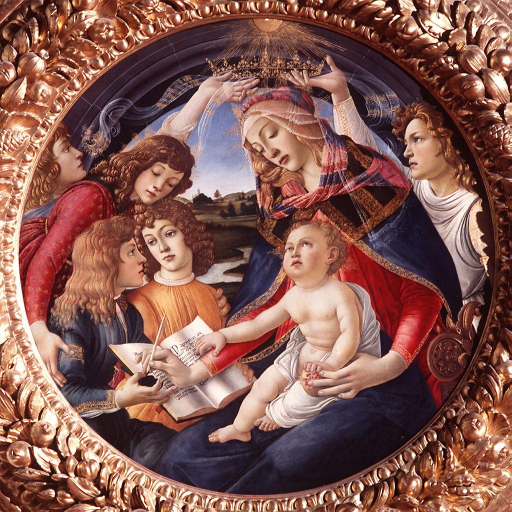 - NOTIZIE STORICO CRITICHE Il dipinto proviene forse da uno dei numerosi conventi soppressi da Pietro Leopoldo di Lorena. Ritenuta fin dai primi studi, come opera autografa del Botticelli, fu identificata dal Milanesi col tondo citato dal Vasari e dal Bocchi in S. Francesco al Monte a Firenze, identificazione generalmente non accettata dalla critica, poiche' il dipinto non coincide iconograficamente con la descrizione vasariana, ove sono ricordati otto angeli anziche' cinque. Creduta dal Cavalcaselle opera giovanile, per la presenza degli influssi del Lippi, viene riferita dallo Horne al periodo immediatamente precedente il soggiorno romano. Del dipinto esistono tre copie conservate a Parigi, Museo del Louvre, a New York, Pierpoint Morgan Library, e a Francoforte, Collezione Hahn