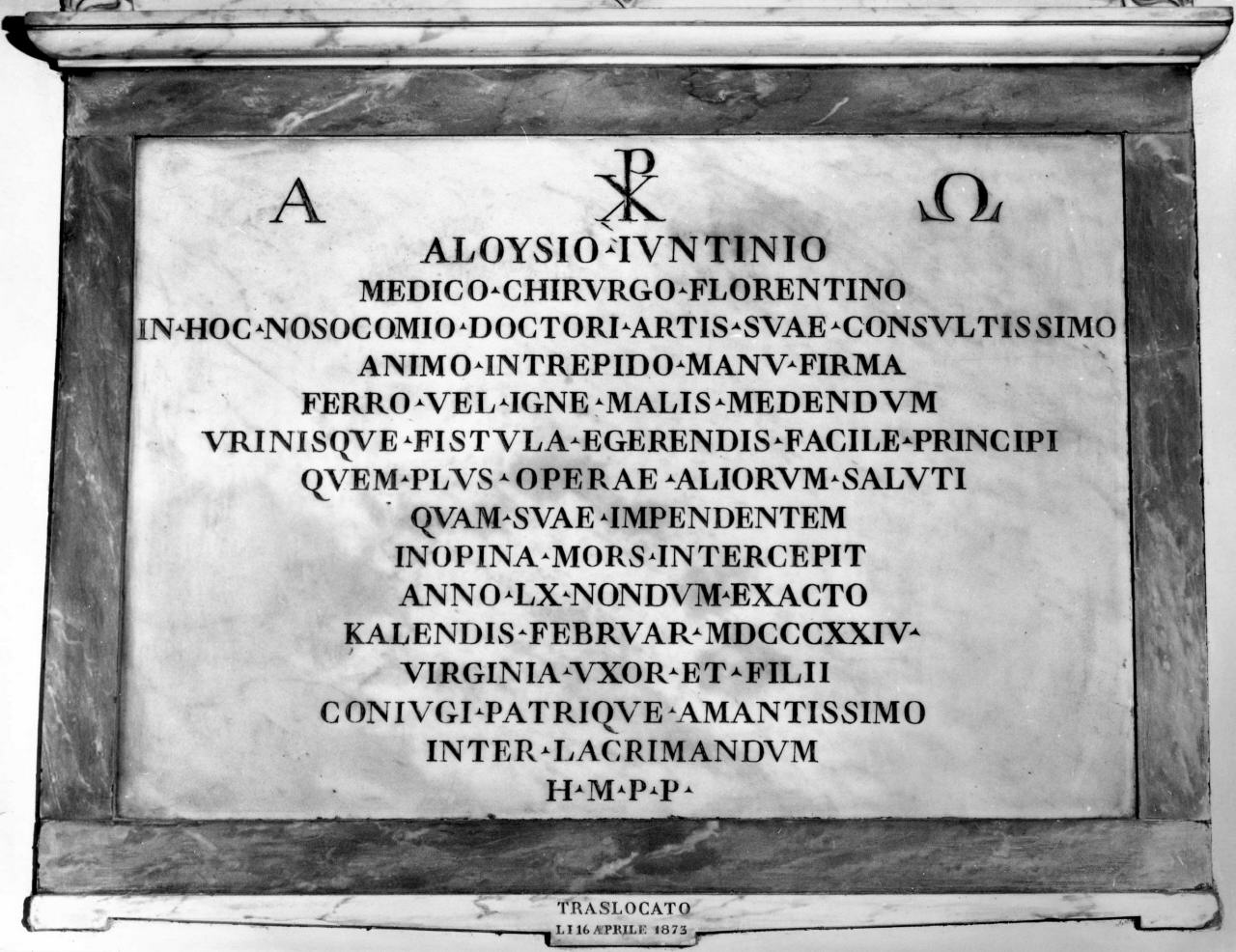 - NOTIZIE STORICO CRITICHE Il busto raffigura Luigi Giuntini (1761-1824), chirurgo di Santa Maria Nuova che alla morte lasciò all'ospedale i suoi strumenti chirurgici e le sue carte. Il Giuntini fu sepolto nel chiostro delle Medicherie e un suo busto in marmo, scolpito nel 1824 dallo scultore altrimenti sconosciuto Luigi Geri, fu collocato nell'anfiteatro chirurgico (Diana, 2013). Nel 1873 la sepoltura fu spostata nella cripta di Sant'Egidio e la lapide sepolcrale e il busto furono sistemati nel chiostro Galli Tassi, sotto il portico (Eadem). Fu forse in questa circostanza che dal busto fu tratto il calco in gesso conservato nelle raccolte dell'ospedale (vd. 0901401306) . Il busto è da riferire a una produzione accademica che bene si accorda con la data (1824) indicata dalla lapide