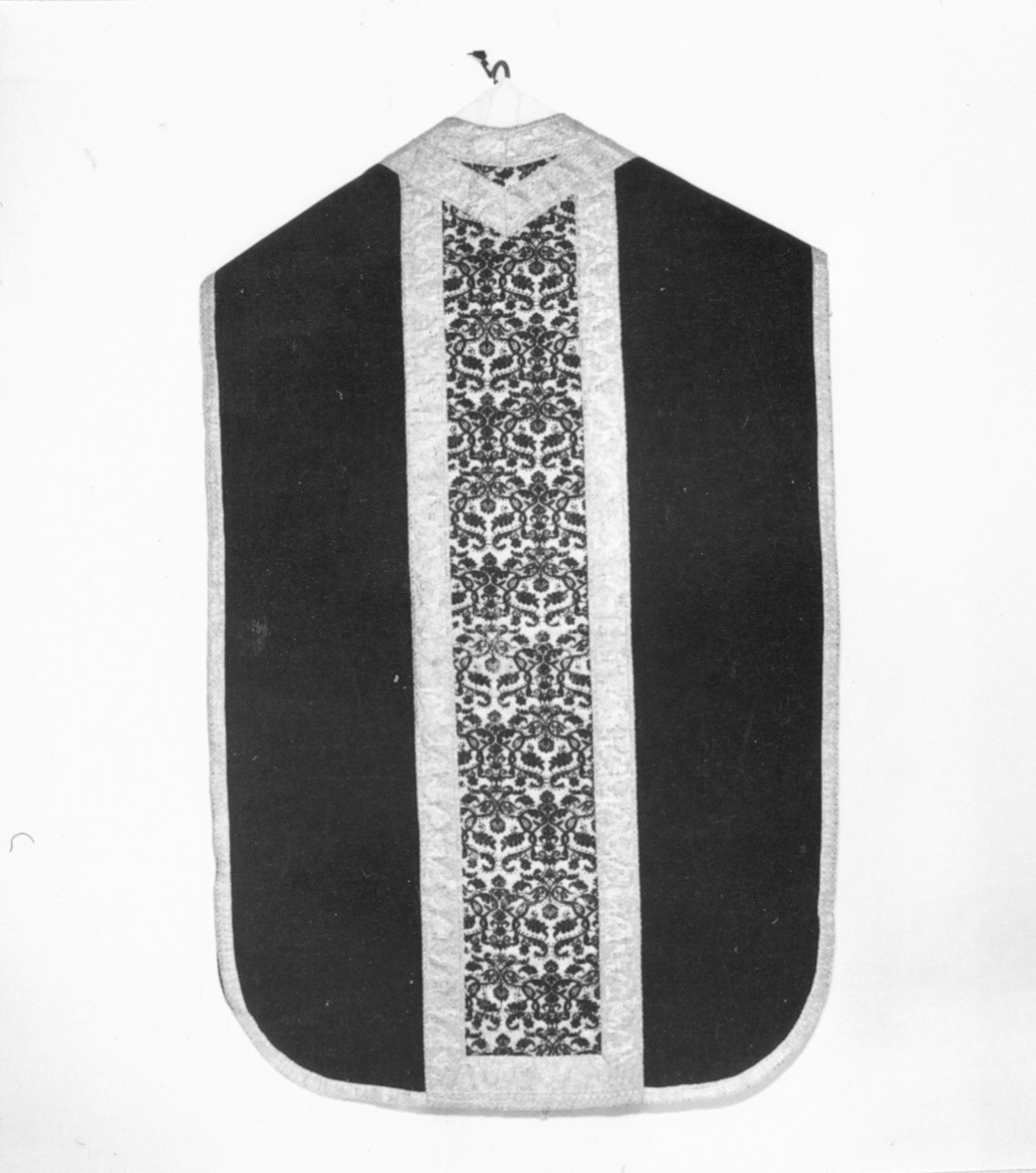 Tre pianete, di cui due plicate, con croci in velluto di seta cesellato nero su fondo bianco laminato d'argento e corpo in velluto nero di cotone unito ad una pianeta di seta alle due plicate. Galloni a telaio in seta e oro. Fodere in taffetas nero