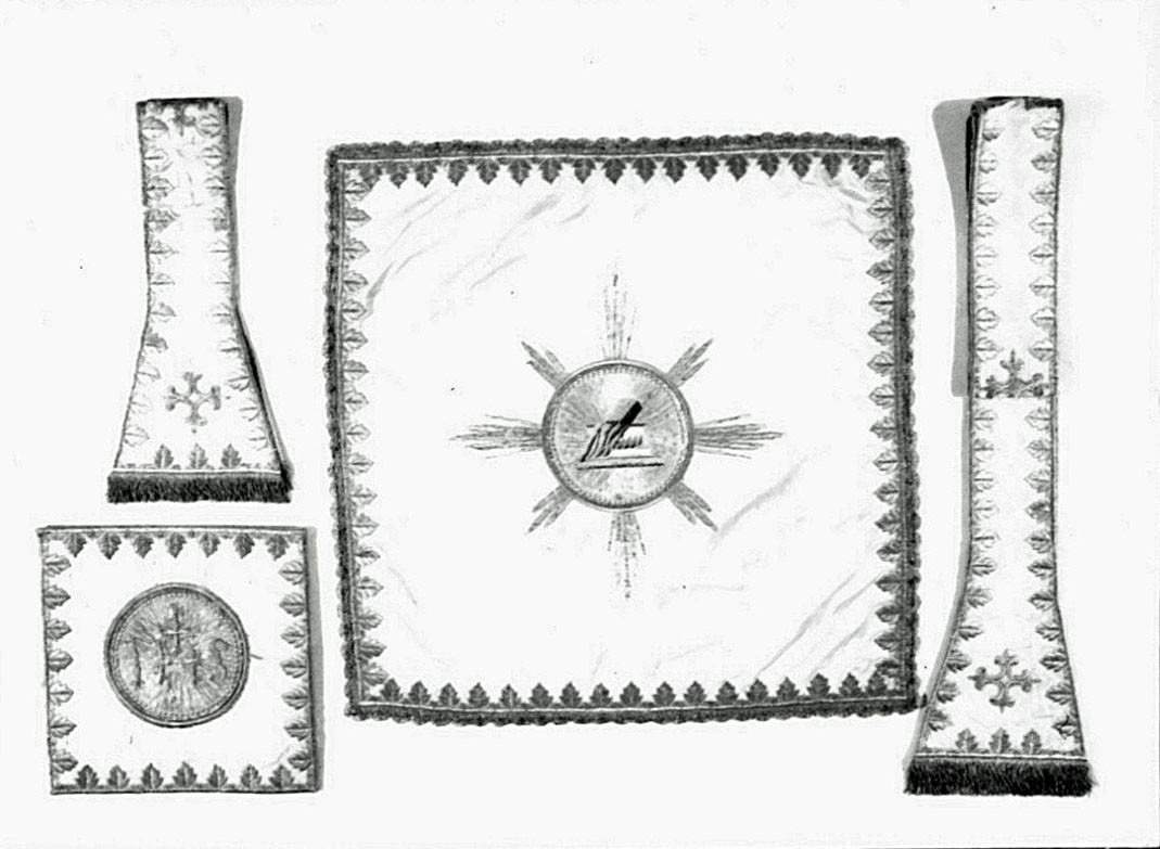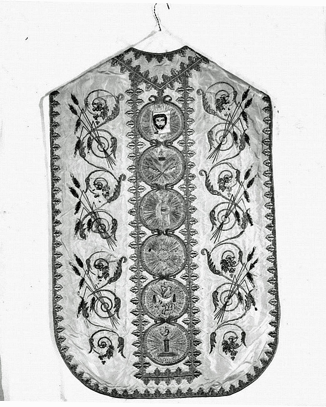 Paramento liturgico composto da una pianeta con stola, manipolo, borsa e velo da calice. Il paramento è in taffetas bianco con ricami in sete policrome, oro filato, oro riccio, argento filato, canutiglia d'oro e d'argento, pajettes d'oro e d'argento, laminette e borchiette d'oro, laminette rame colorato. Le fodere sono in taffetas giallo. Entro dei medaglioni sono ricamati i simboli della passione di Cristo