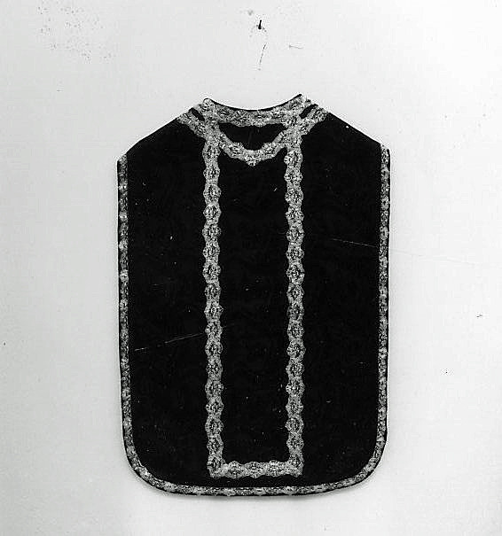 Paramento liturgico costituito da pianeta, stola, manipolo, borsa e velo di calice. Il paramento è in seta nera operata ad effetti damascati con fodera in taffetas nero e trina a fuselli in oro riccio, filato e lamellare. Il motivo del tessuto è costituito da un rametto di geranio con ghiande racchiuso in maglie irregolari formate dall'intreccio di nastri. Il numero di inventario sulla fodera della pianeta è ricamato a punto croce
