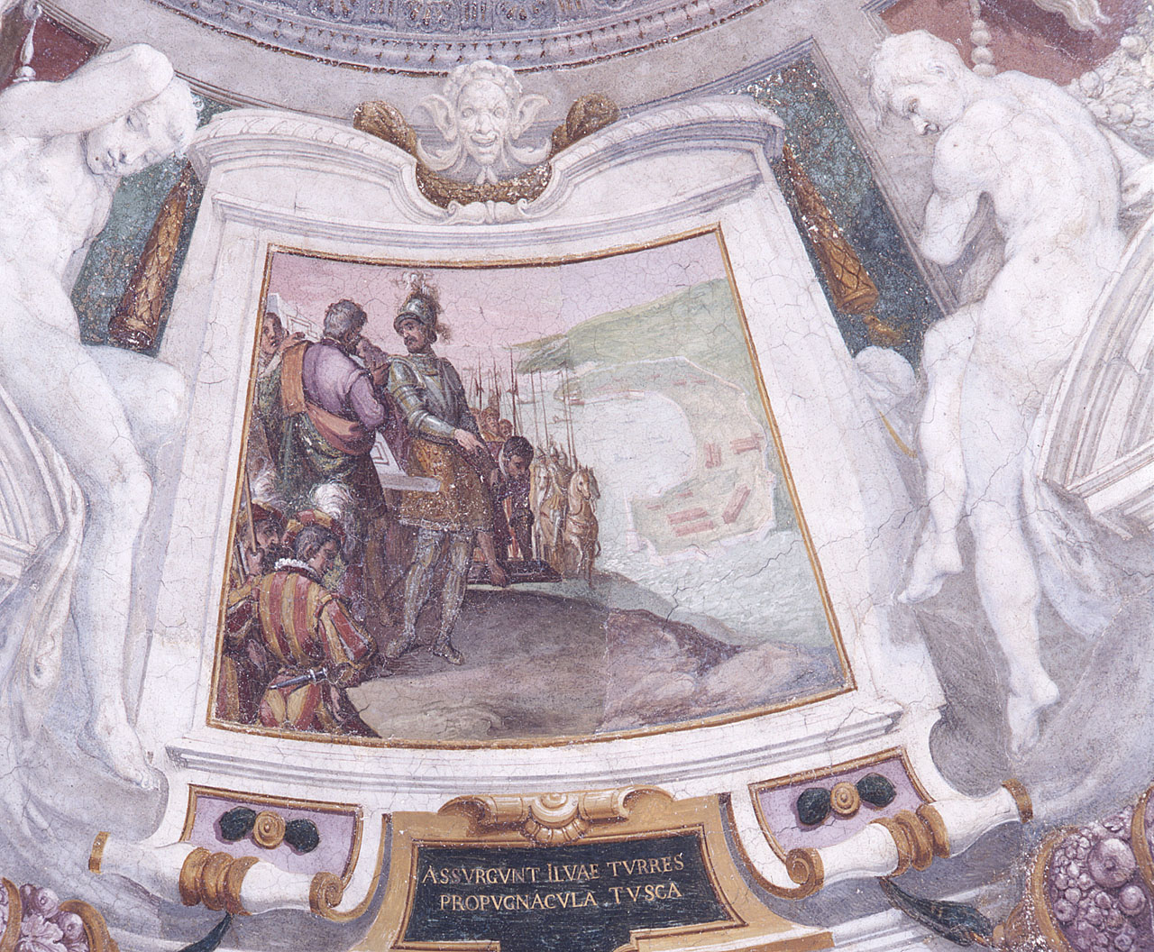 - ISCRIZIONI sotto l'affresco - ASSURGUNT ILUAE TURRES/ PROPUGNACULA TUSCA - lettere capitali - a pennello - latino