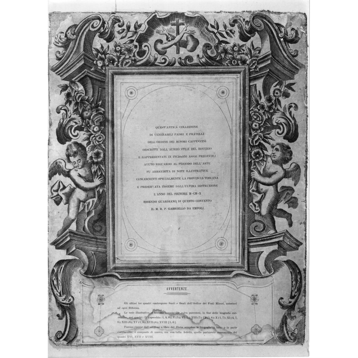 - ISCRIZIONI parte centrale - QUEST'ANTICA COLLEZIONE/ DI VENERABILI PADRI E FRATELLI/ DELL'ORDINE DEI MINORI CAPPUCCINI/ DESCRITTI DALL'AUREO STILA DEL BOVERIO/ E RAPPRESENTATI IN INCISIONI ASSAI PREGEVOLI AVUTO RIGUARDO AL PERIODO DELL'ARTE/ FU ARRCCHITA DI NOTE ILLUSTRATIVE/ CONCERNENTE SPECIALMENTE LA PROVINCIA TOSCANA/ E PRESERVATA INSIEME DALL'UTIMA DISTRUZIONE/ L'ANNO DEL SIGNORE M-CM-X/ ESSENDO GUARDIANO DI QUESTO CONVENTO/ IL M.R.P. GABRIELLO DA EMPOLI - lettere capitali -