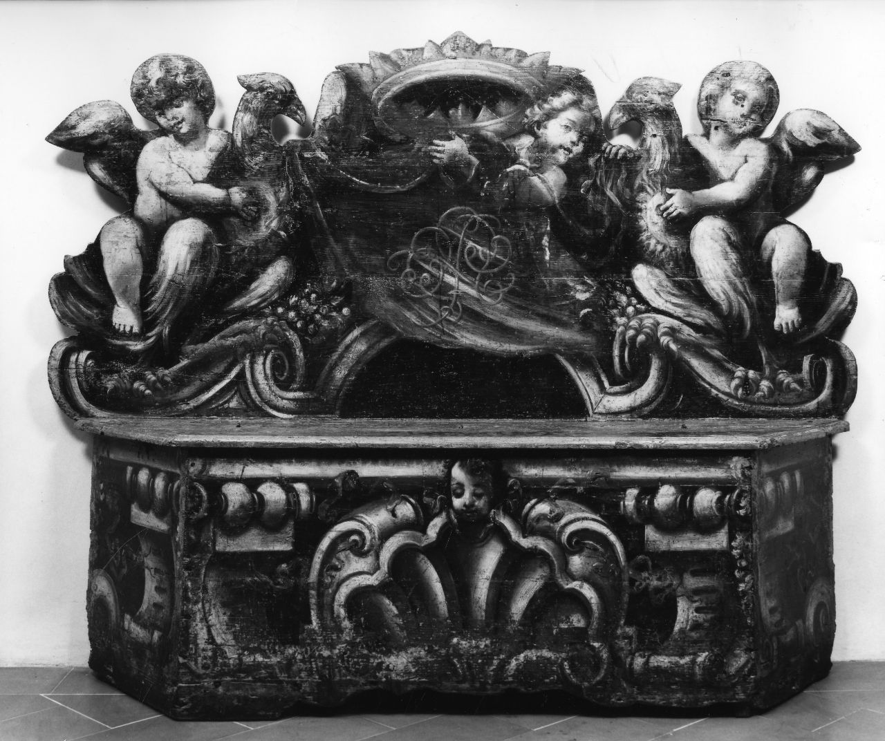 - NOTIZIE STORICO CRITICHE La cassa presenta sul fronte una conchiglia ornata da una testa di putto e affiancata da mensole a ricciolo. Lo schienale ha un motivo di voluta a riccioli su cui sono posate ai lati due aquile che reggono sul dorso un putto ciascuna. Al centro un puttino che regge una corona e stende un drappo ornato da un elaborato monogramma. I colori sono il grigio allusivo alla pietra serena e l'oro per la corona e il monogramma. Mobile di ascendenza romana di fattura piuttosto gradevole anche se di esecuzione poco accurata che denota probabilmente provinciale, databile tra la seconda metà del XVII secolo e gli inizi del secolo successivo. La cassapanca ha un pendant speculare (cfr. scheda con foto 363005) e fa parte di un insieme di mobili atti a decorare una galleria o un atrio (cfr. scheda con foto 245077, 245081). Il mobile di ascendenza romana è probabilmente eseguito in ambito provinciale laziale: è databile tra la fine del XVII secolo e i primi anni del secolo successivo