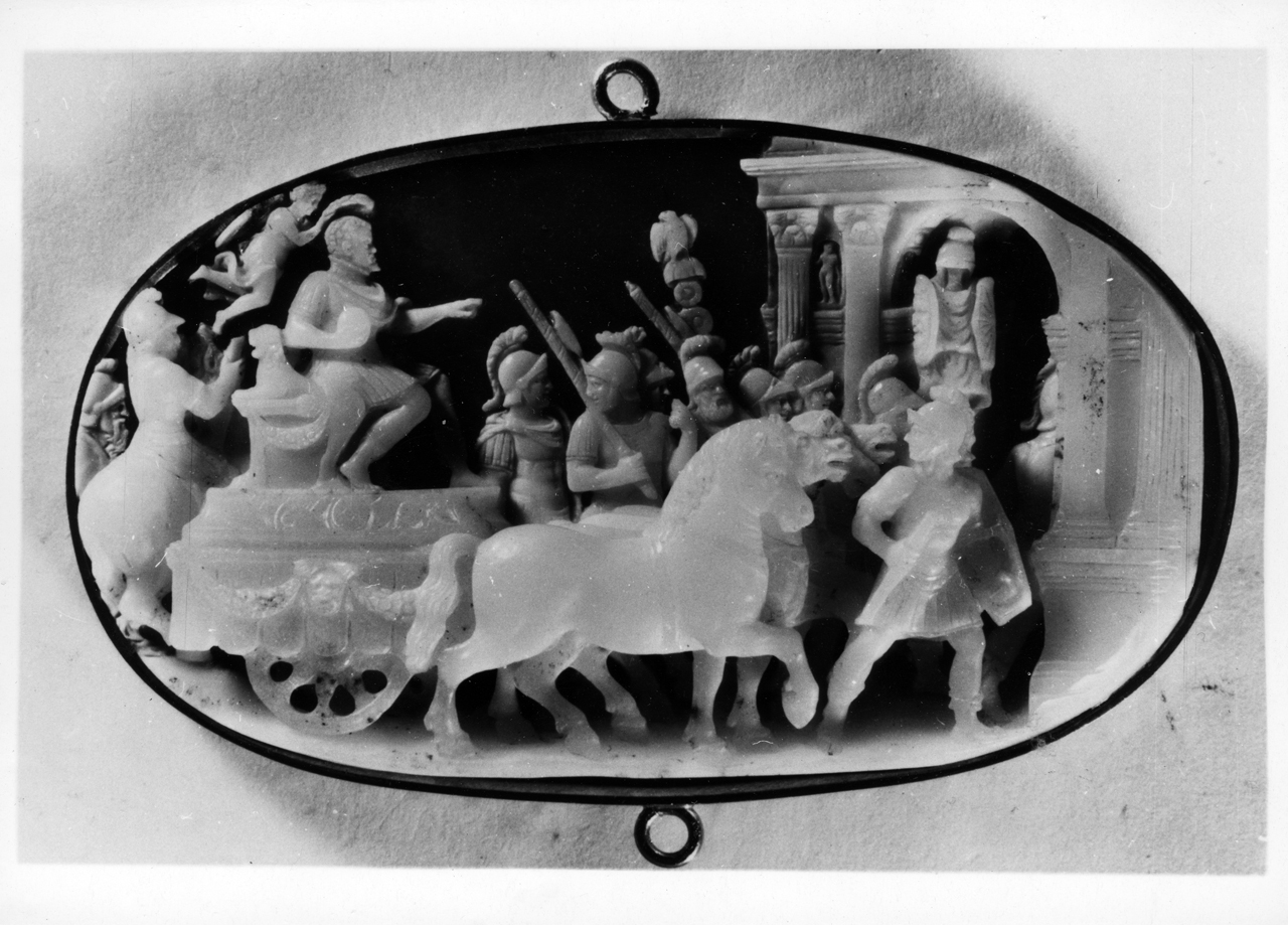 - NOTIZIE STORICO CRITICHE Il cammeo, firmato D(ome)NICVS ROMANVS F. (cioè FECIT) arrivò nella collezione medicea con altri cammei facenti parte della collezione del vescovo di Viterbo, già offerta al granduca Cosimo nel 1565, solo nel 1575. Fu quindi acquistato da Francesco I, granduca dal 1574 al 1587. Dal 1676 in poi il cammeo compare citato negli inventari sotto il titolo "Il trionfo di Cosimo I" e solo successivamente come "L'ingresso di Cosimo I a Siena" (avvenuto il 28 ottobre del 1560). Su tale riconoscimento non esistono elementi probanti, anzi il documento di archivio che attesta l'acquisto escluderebbe tale ipotesi, facendo riferimento a un "Re cattolico ritratto al naturale che trionfa", ovvero Filippo II di Spagna. Complessi i problemi di identificazione del suo autore. Si è ipotizzato che possa trattarsi di Domenico Compagni, detto anche Domenico dei Cammei, documentato a Roma nel 1567, autore di diverse medaglie ed in contatto con la corte medicea nel 1578. Un "Domenico Romano" risulta comunque attivo a Firenze, ma come "pittore", nella prima metà del XVI secolo e collaborò con il Salviati alla decorazione di alcune stanze di Palazzo Vecchio (E. Allegri, A. Cecchi, "Palazzo Vecchio e i Medici", Firenze 1980)
