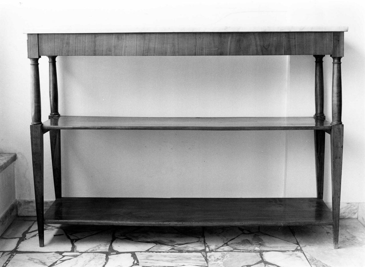 Posale in legno di ciliegio sormontato da marmo bianco. Tengono unite le quattro zampine, tornite nella parte superiore e a tronco di pirmaide in quella inferiore, due mensole