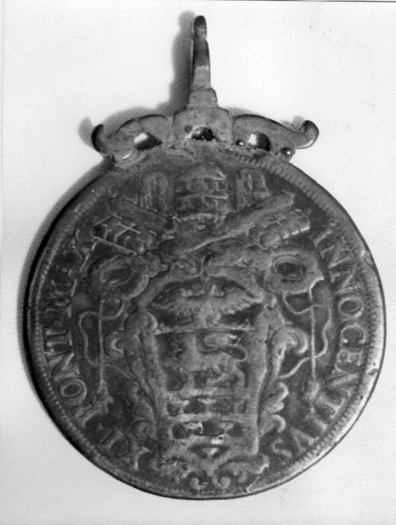 Moneta in bronzo fuso e cesellato, montata a pendente. Recto: stemma con aquila, leone e ai lati simboli pontifici. Verso: una corona di quercia circonda un'iscrizione