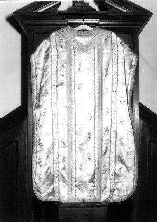 Pianeta a bande verticali verde, crema, verde e disegni color pastello chiaro. Bande verticali di motivi ondulanti fioriti, alternate ad altre più strette con piccolo tralcio continuo di fiorellini e foglie. Gallone in seta gialla, oro filato e oro lamellare ad andamento a zig-zag. Fodera in tela rosacea antica