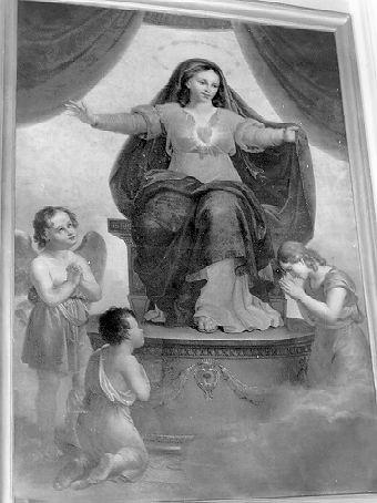 Madonna in trono con cuore fiammeggiante sul petto in veste rossa e manto blu. Ai suoi piedi un angelo e due fanciulli. Fondo giallo, cortine verdi