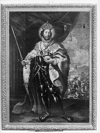 In un ambiente caratterizzato a sinistra da una colonna rastremata e da un tendaggio è situato in primo piano un santo coronato: il sovrano veste un'armatura ricoperta da manto in pelliccia, sul quale pende un collare con medaglione al centro, e regge in una mano il globo crucifigero, mentre con l'altra leva una spada; in lontananza, sullo sfondo di un paesaggio, è figurata una scena di battaglia