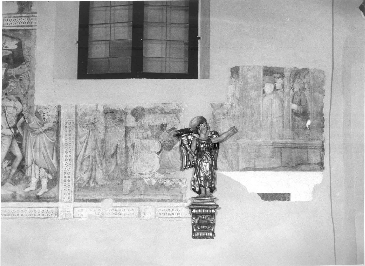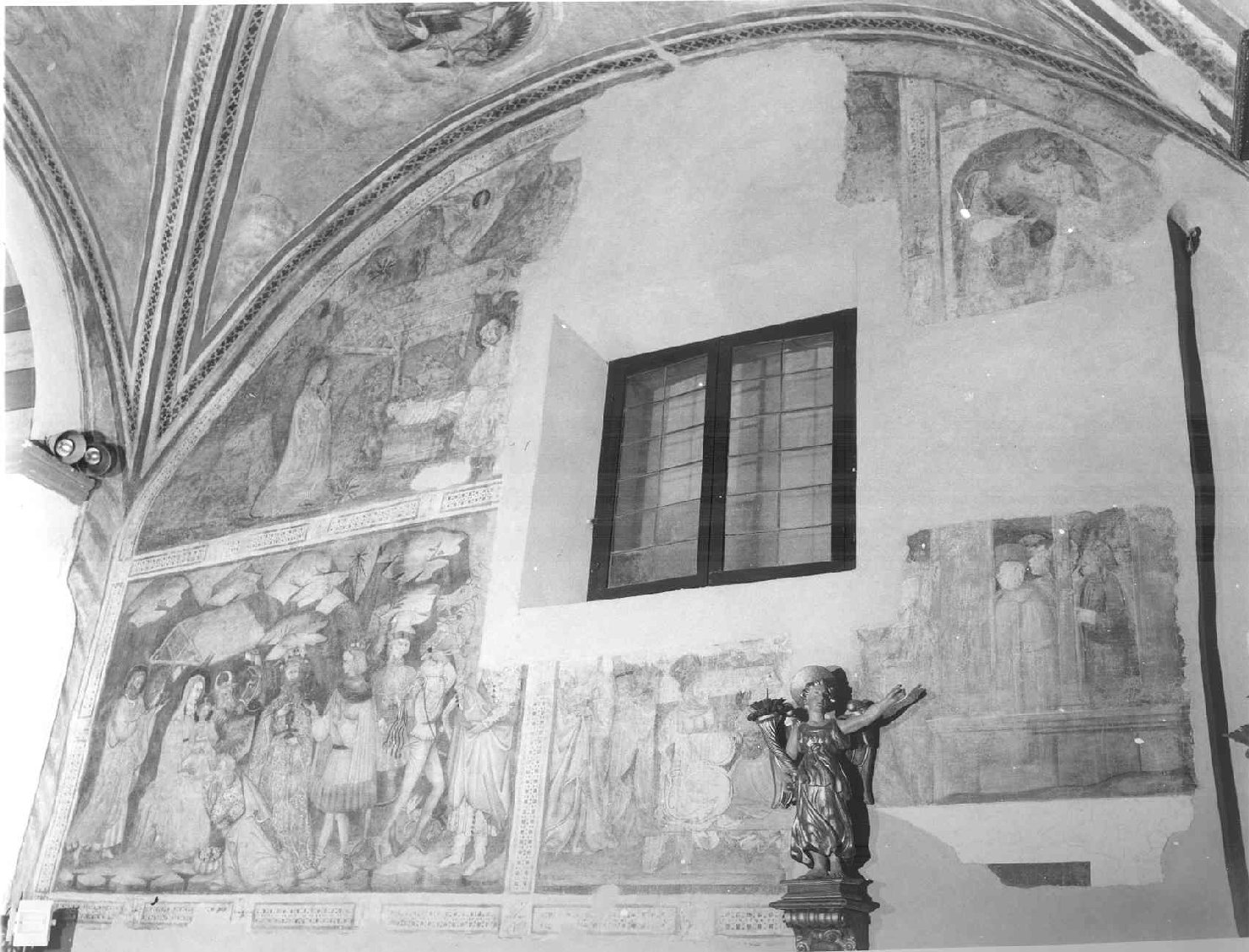 - NOTIZIE STORICO CRITICHE Scarse sono le notizie riguardanti i dipinti. IlPiombanti li cita come opere della scuola dei giotteschi. analogamente il Lotti si limita a segnalarli dicendoli trecenteschi. Il termin post quem per la datazione dei dipinti è certamente 1399, anno in cui l'oratorio venne destinato a custodire l'immagine del S.mo Crocifisso. I caratteri stilistici delle opere in questione, vicini a quelle dei seguaci di Agnolo Gaddi, come Niccolò Gerini e Cenni di Francesco, inducono a datarle al secondo decennio del sec. XV. Nell'anno 1411 compare nelle carte d'archivio del comune di San Miniato (Arch. Com. S. Min. Vicariato, 1598,c; 4v) il nome del pittore pratese Arrigo di Niccolò, già attivo con Niccolò Gerini in Palazzo Datini a Prato. Nel 1409, Arrigo eseguì nel palazzo del mercante pratese una serie di lunette in cui sono raffigurate delle scene di caccia, dei paesaggi e degli animali. Il raffronto tra queste raffigurazioni e le scene dell'Oratorio del Loretino permette di ravvisare in queste ultime la mano del pittore pratese. Particolarmente probante risulta il confronto tra gli animali rappresentati in alazzo Datini e quelli posti nelle scene dell'Adorazione dei Magi e nella Natività. Nei dipinti dell'oratorio appare però anche l'intervento di almeno un altro artista. la scena dell'Adorazione dei Magi presenta delle analogie con la composizione dallo stesso soggetto che si trova nella predella del polittico eseguito nel 1413 da Piero di Miniato per il Ceppo dell'eredità Datini, ora nella Galleria Comunale di Prato; Piero e Arrigo di Niccolò avevano già lavorato insieme al servizio del mercante pratese, e si può periò ritenere plausibile che Piero abbia avuto una certa parte nei dipinti del Loretino. Non bisogna dimenticare inoltre che il ciclo in questione si inserisce in una cospiqua serie di interventi decorativi che ebbero luogo a San Miniato nei primi decenni del XV secolo e che sono tutti riconducibili alla bottega di Niccolò di Pietro Gerini. Particolarmente vicini agli artisti attivi nel loretino appaiono quelli che, sulla scia di Cenni di Francesco (anch'egli sicuramente a Sa Miniato ancora nel 1411), affrescano la volta della seconda crociera dell'oratorio di Sant'Urbano e le scene della vita di Maria nella cappella degli Armaleoni a S. Domenico. Ulteriori assonanze possono riscontrarsi con le opere del maestro, vicino ai modi di Lorenzo di Bicci, che adorna con Allegorie della Venuta di Cristo la volta della prima crociera dell'oratorio di Sant'urbano e probabilmente dipinge gli affreschi monocromi con mezze figure di santi nella cripta dello stesso convento di S. Domenico. Particolare considerazione merita la tecnica esecutiva dei dipinti. Nel corso del restauro si è constatato che essi sono eseguiti a secco su intenaco facendo uso di particolari colori a tempera impiegati per lo più dai miniatori: in particolare rosso al minio, azzurrite, verde all'ossido di rame. Per le lumeggiature e le pieghe delle vesti è stato fatto uso di bianco di biacca. Ciò ha reso necessario l'uso di un legante particolare, probabilmente a base di gomma arabica, anch'esso impiegato nelle decorazioni miniate, e spiega il particolare effetto cromatico dei dipinti della fascia inferiore. Questo tipo di tecnica lega le opere in questione alle decorazioni araldiche eseguite, probabilmente negli stessi anni, nella Sala del consiglio del Palazzo comunale di San Miniato, nel locale soprastante lo stesso oratorio del Loretino. Inoltre la tecnica e il tipo di decorazioni vegetali che compaiono nei dipinti, consentono di riconnetterli all'ambiente artistico pratese e pistoiese del primo Quattrocento, fornendo così un ulteriore conferma all'ipotesi attributiva qui formata