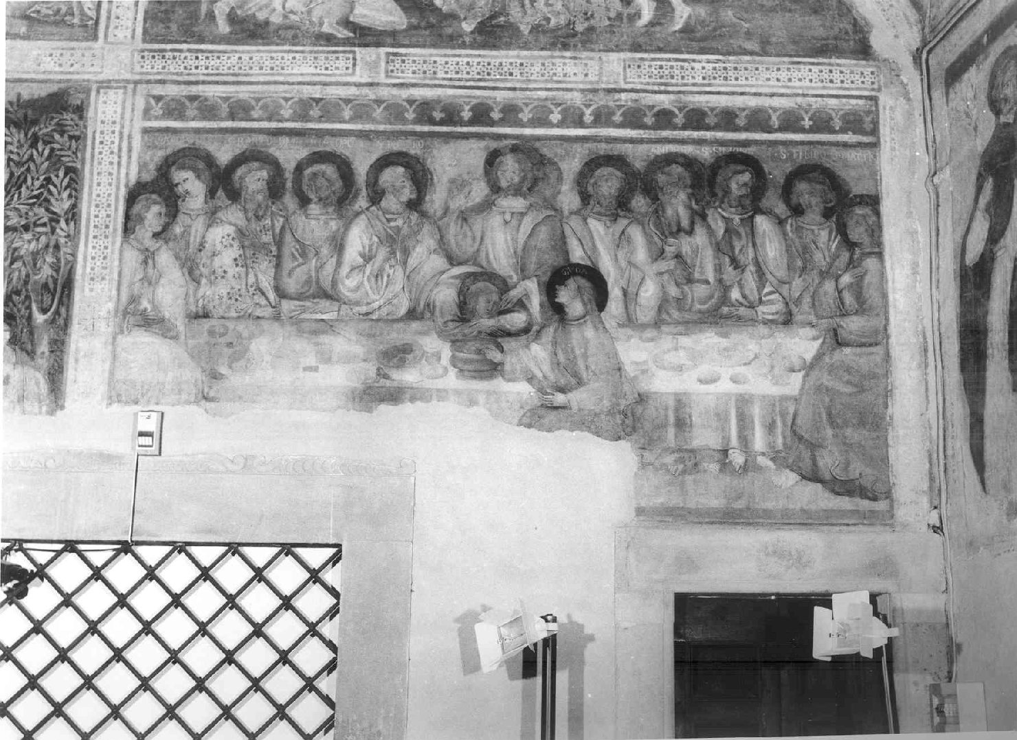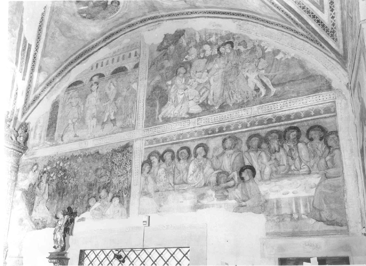 • NOTIZIE STORICO CRITICHE Scarse sono le notizie riguardanti i dipinti. IlPiombanti li cita come opere della scuola dei giotteschi. analogamente il Lotti si limita a segnalarli dicendoli trecenteschi. Il termin post quem per la datazione dei dipinti è certamente 1399, anno in cui l'oratorio venne destinato a custodire l'immagine del S.mo Crocifisso. I caratteri stilistici delle opere in questione, vicini a quelle dei seguaci di Agnolo Gaddi, come Niccolò Gerini e Cenni di Francesco, inducono a datarle al secondo decennio del sec. XV. Nell'anno 1411 compare nelle carte d'archivio del comune di San Miniato (Arch. Com. S. Min. Vicariato, 1598,c; 4v) il nome del pittore pratese Arrigo di Niccolò, già attivo con Niccolò Gerini in Palazzo Datini a Prato. Nel 1409, Arrigo eseguì nel palazzo del mercante pratese una serie di lunette in cui sono raffigurate delle scene di caccia, dei paesaggi e degli animali. Il raffronto tra queste raffigurazioni e le scene dell'Oratorio del Loretino permette di ravvisare in queste ultime la mano del pittore pratese. Particolarmente probante risulta il confronto tra gli animali rappresentati in alazzo Datini e quelli posti nelle scene dell'Adorazione dei Magi e nella Natività. Nei dipinti dell'oratorio appare però anche l'intervento di almeno un altro artista. la scena dell'Adorazione dei Magi presenta delle analogie con la composizione dallo stesso soggetto che si trova nella predella del polittico eseguito nel 1413 da Piero di Miniato per il Ceppo dell'eredità Datini, ora nella Galleria Comunale di Prato; Piero e Arrigo di Niccolò avevano già lavorato insieme al servizio del mercante pratese, e si può periò ritenere plausibile che Piero abbia avuto una certa parte nei dipinti del Loretino. Non bisogna dimenticare inoltre che il ciclo in questione si inserisce in una cospiqua serie di interventi decorativi che ebbero luogo a San Miniato nei primi decenni del XV secolo e che sono tutti riconducibili alla bottega di Niccolò di Pietro Gerini. Particolarmente vicini agli artisti attivi nel loretino appaiono quelli che, sulla scia di Cenni di Francesco (anch'egli sicuramente a Sa Miniato ancora nel 1411), affrescano la volta della seconda crociera dell'oratorio di Sant'Urbano e le scene della vita di Maria nella cappella degli Armaleoni a S. Domenico. Ulteriori assonanze possono riscontrarsi con le opere del maestro, vicino ai modi di Lorenzo di Bicci, che adorna con Allegorie della Venuta di Cristo la volta della prima crociera dell'oratorio di Sant'urbano e probabilmente dipinge gli affreschi monocromi con mezze figure di santi nella cripta dello stesso convento di S. Domenico. Particolare considerazione merita la tecnica esecutiva dei dipinti. Nel corso del restauro si è constatato che essi sono eseguiti a secco su intenaco facendo uso di particolari colori a tempera impiegati per lo più dai miniatori: in particolare rosso al minio, azzurrite, verde all'ossido di rame. Per le lumeggiature e le pieghe delle vesti è stato fatto uso di bianco di biacca. Ciò ha reso necessario l'uso di un legante particolare, probabilmente a base di gomma arabica, anch'esso impiegato nelle decorazioni miniate, e spiega il particolare effetto cromatico dei dipinti della fascia inferiore. Questo tipo di tecnica lega le opere in questione alle decorazioni araldiche eseguite, probabilmente negli stessi anni, nella Sala del consiglio del Palazzo comunale di San Miniato, nel locale soprastante lo stesso oratorio del Loretino. Inoltre la tecnica e il tipo di decorazioni vegetali che compaiono nei dipinti, consentono di riconnetterli all'ambiente artistico pratese e pistoiese del primo Quattrocento, fornendo così un ulteriore conferma all'ipotesi attributiva qui formata