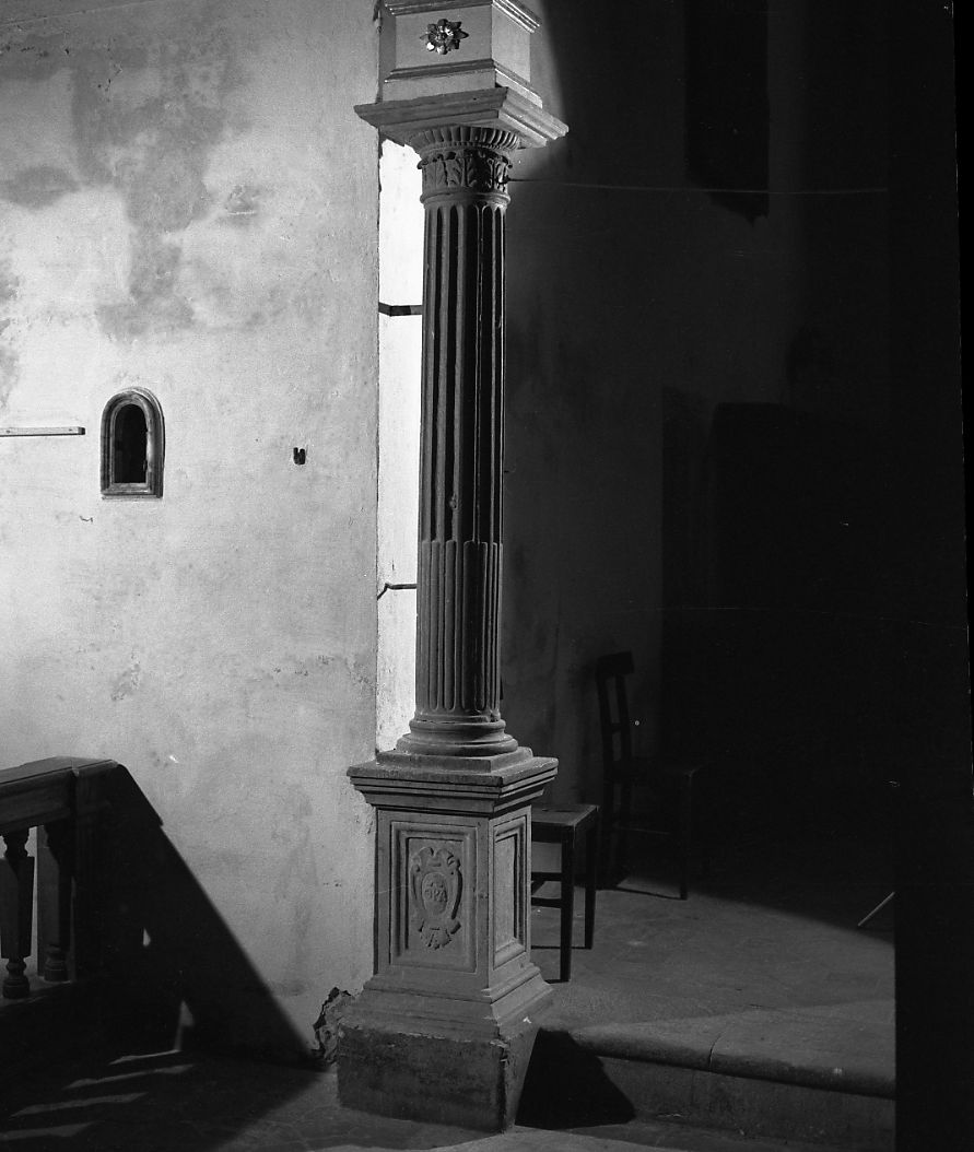 Coppia di colonne in pietra serena con alto basamento a forma parallelepipeda con riquadri rettangolari su ogni lato. Fusto rudentato con capitello formato da foglie arricciate, echino baccellato. Abaco in aggetto di forma rettangolare