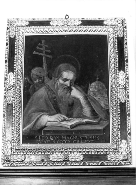 Papa Leone I è raffigurato a mezzo busto, seduto davanti un tavolo su cui poggia un libro aperto. Ha un copricapo e una mantellina rossa e il volto incorniciato da barba. Dietro di lui un angelo regge la croce papale; al suo fianca la tiara. In basso iscrizione a caratteri dorati. Cornice intagliata a ovoli e foglie dorate in campo marrone