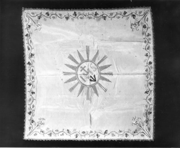 Velo da calice bianco con disegno in seta policroma. Al centro, il monogramma di Cristo raggiato. Lungo il perimetro, un esile tralcetto con fiori e grappoli d'uva si snoda con andamento onduilante. Negli angoli, mazzetti di fiori e spighe di grano. Trina di profilatura in oro filato a ventaglietti e fodera in seta naturale