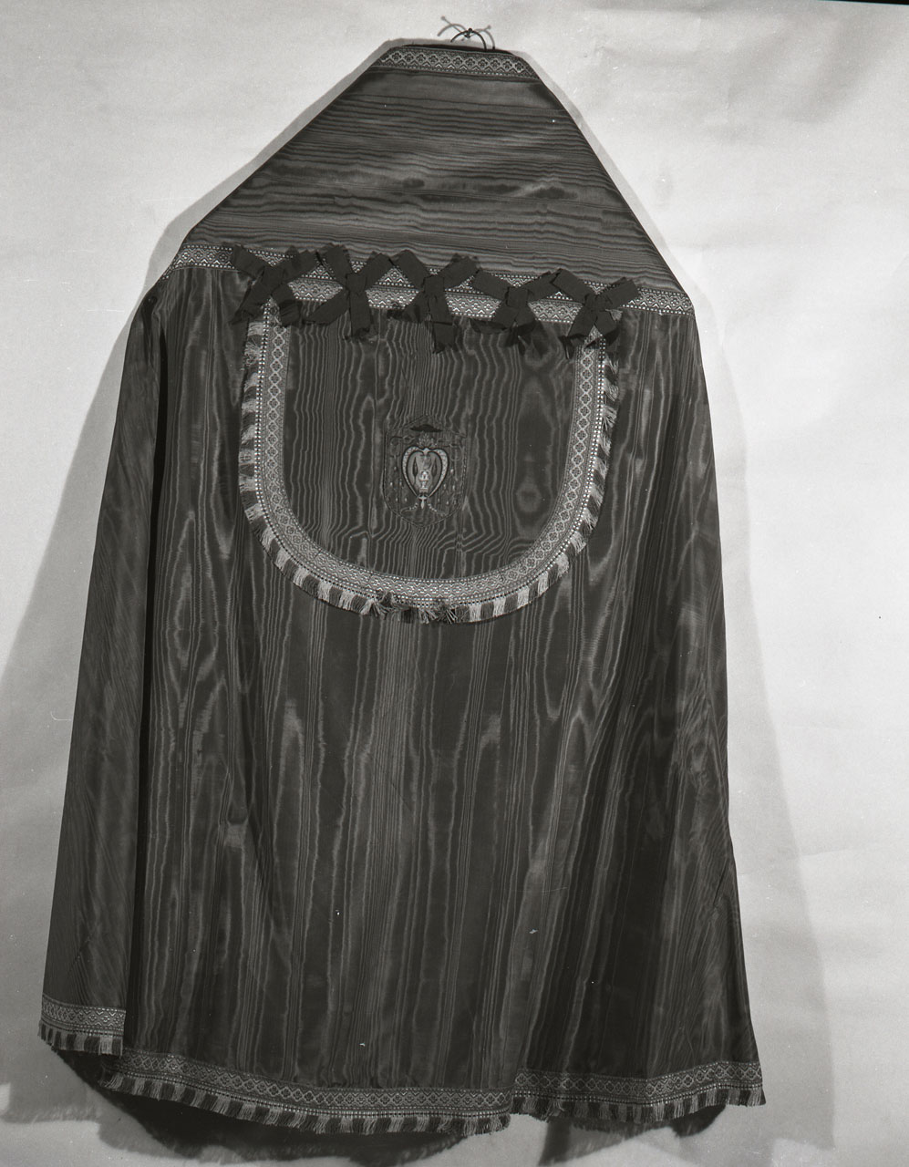 Piviale in raso moiré verde brillante con gallone a piccoli fiori stilizzati. Il cappuccio è decorato da cinque fiocchi in seta