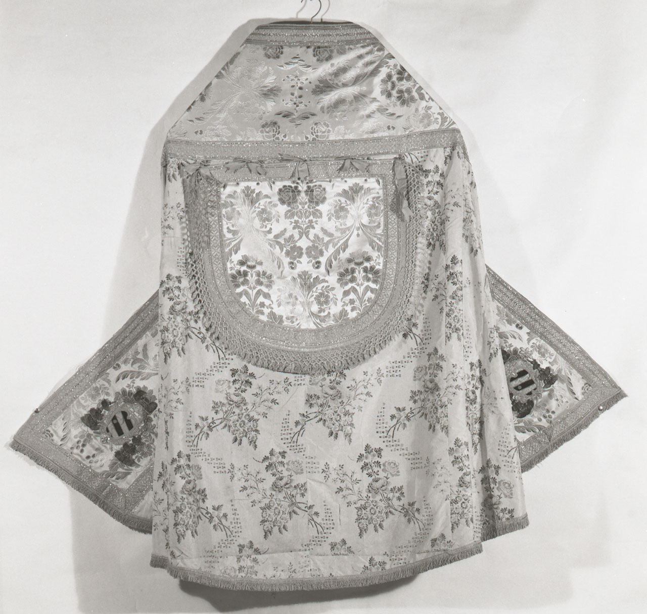 Piviale in raso a fondo avorio operato a piccoli motivi vegetali serpeggianti alternati a mazzi di fiori policromi; lo stolone e il cappuccio sono in raso avorio ricamati a mazzi simmetrici di fiori, tralci di rose e lunghe foglie con fiori e spighe trattenuti da piccole corone. Gallone in oro a motivi vegetali, arricchito sul cappuccio da cinque fiocchi di seta
