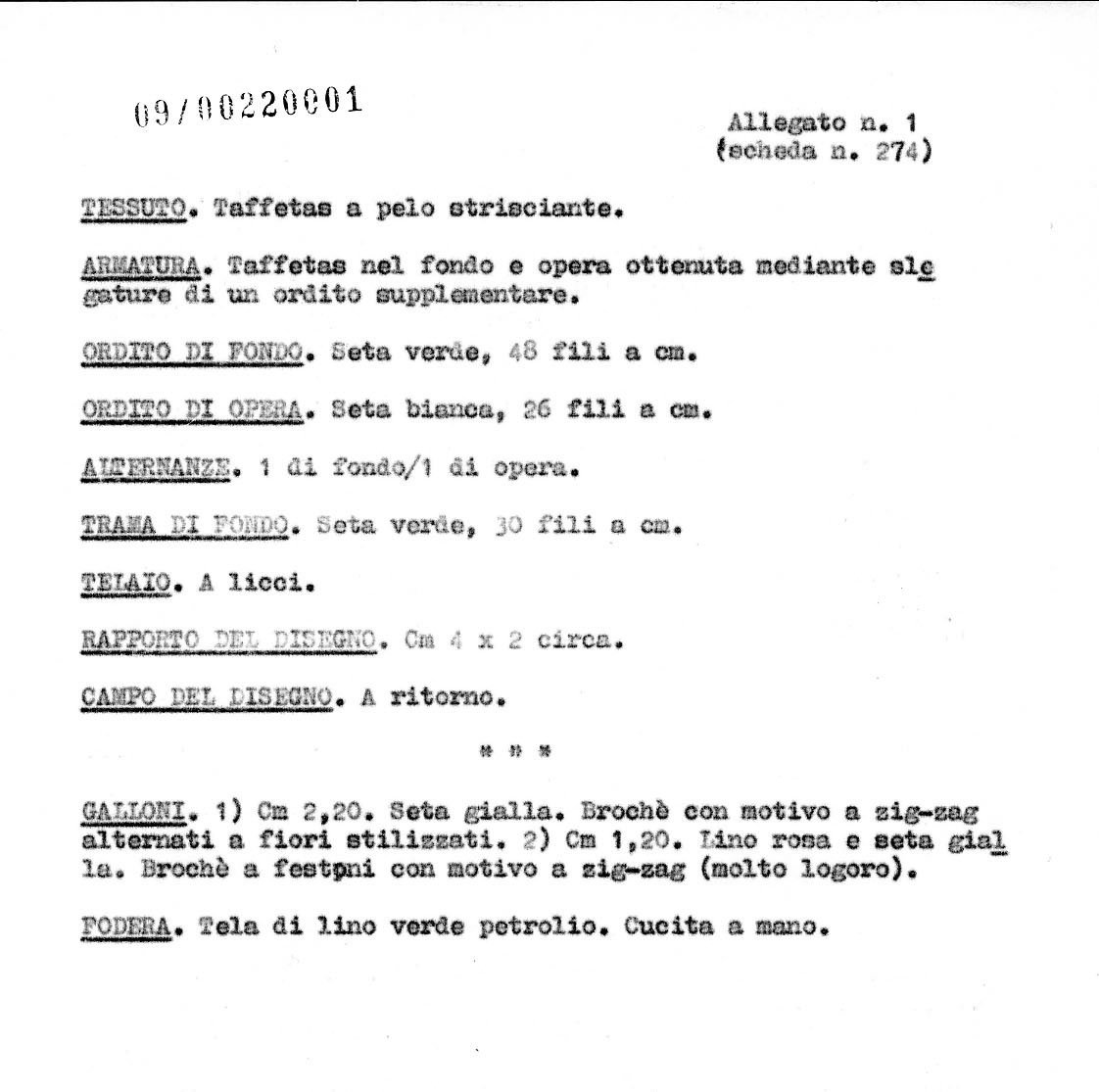 - NOTIZIE STORICO CRITICHE La pianeta è il risultato del reimpiego di stoffe di due diverse tecniche, colori e decori, utilizzate una per la fascia centrale, l'altra per le laterali. La stoffa delle fasce laterali, originariamente in faglia, è stata ampiamente integrata con inserti identici di taffettà. La ricomposizione della pianeta è dovuta al sec. XIX; la fascia centrale in raso è presumibilmente del sec. XVIII a differenza delle laterali che per il modello decorativo sembrano dipendere dal sec. XIX