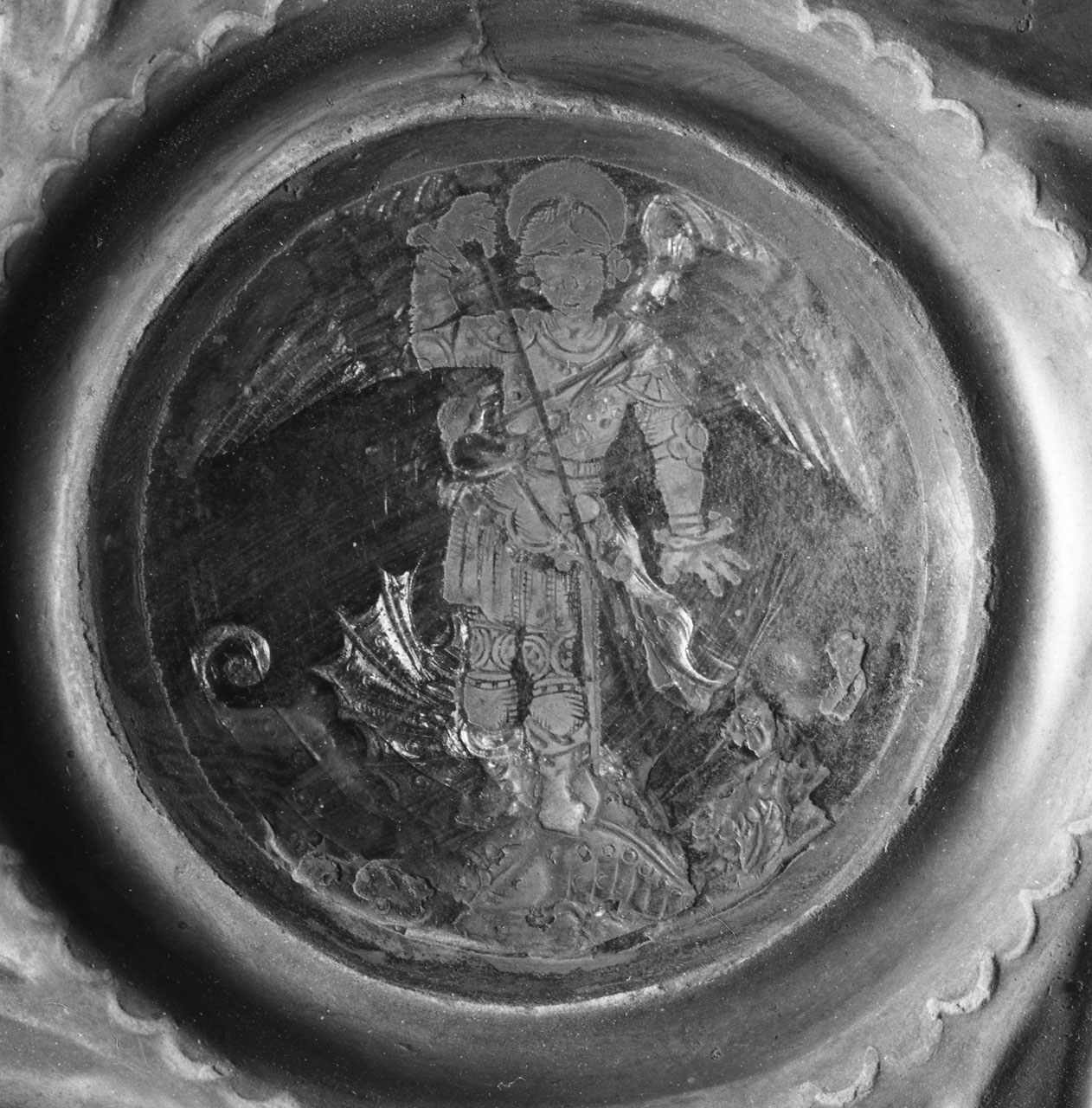 Piatto circolare ansato, con tesa ornata da una ornamentazione a stampo di foglie stilizzate e con piccolo festone di petali che si ripete anche sul fondo, lavorato a sbalzo. Un medaglione circolare in smalto traslucido decora il fondo del piatto in esso è raffigurato San Michele Arcangelo, patrono di Castiglion Fiorentino. Al centro vi è una baccellatura a losanghe incorniciata da una iscrizione in carateeri gotici tedeschi, in parte consunta