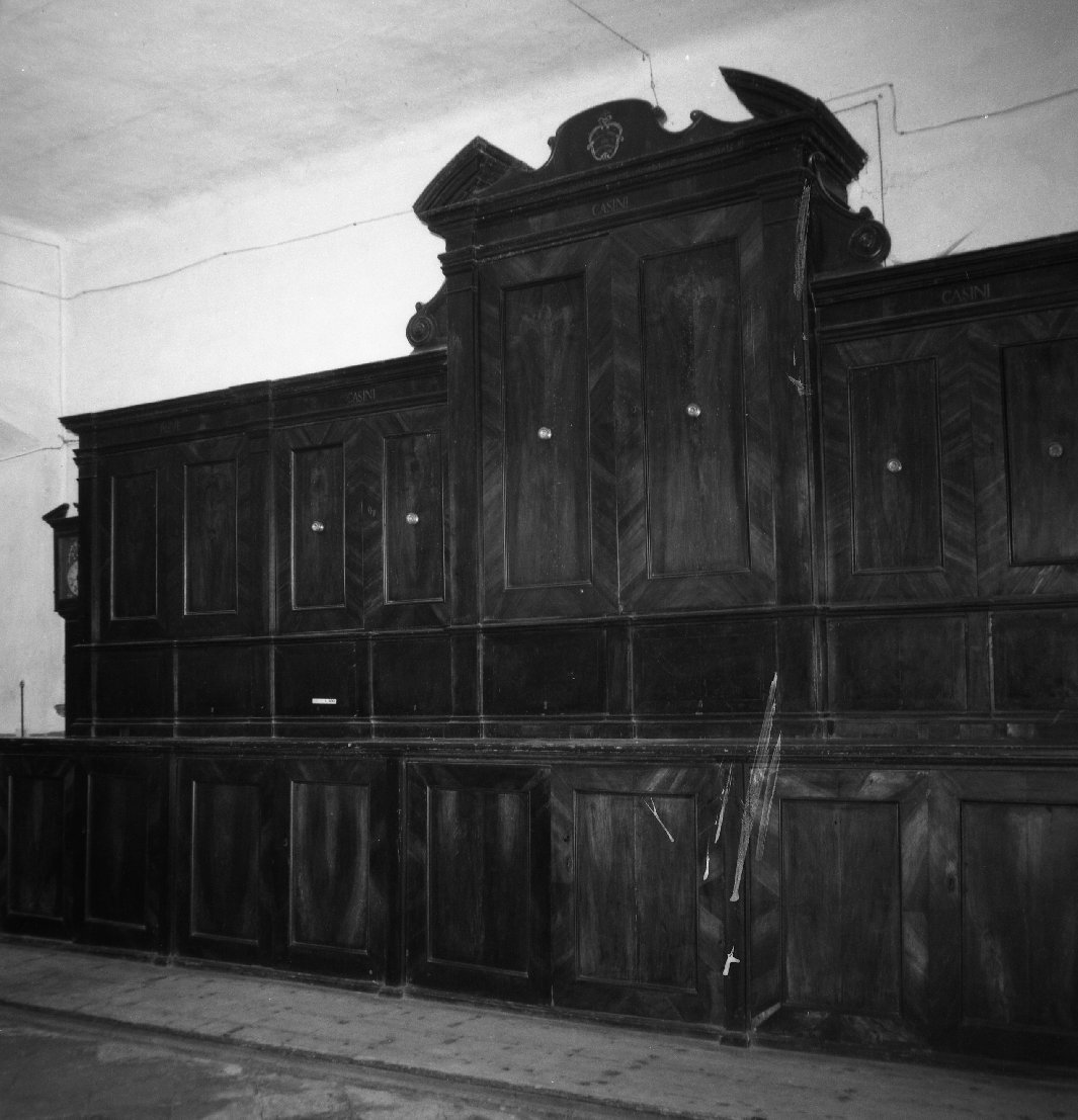 Mobile da sacrestia costituito da due elementi, uno inferiore, l'altro superiore. La base è costituita da cinque vani in lettere con sportelli a doppia anta; ai due laterali corrispondono in alzato altre due con sportelli sempre a doppia anta, mentre al vano centrale corrisponde in alzato una sorta di frontale architettonico con frontone spezzato e frontespizio archiacuto; qui è dipinto lo stemma dei Casini scritta che si ritrova all'architrave sottostante