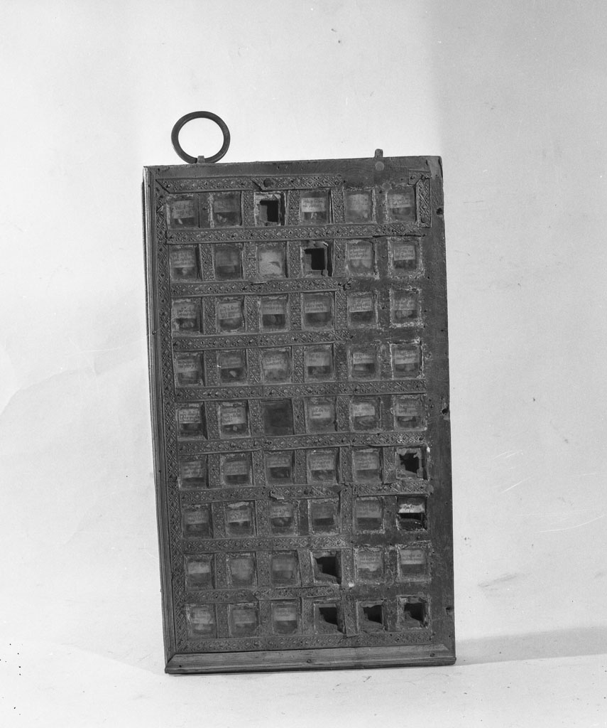Reliquiario ligneo composto da due valve, incernierate e mobili, con parziale cornice in metallo dorato, scanditi da cinquantaquattro teche quadrangolari, alcune delle quali contenente reliquie di santi con iscrizione esplicativa, in caratteri gotici, parzialmente leggibile; gli scomparti sono riquadrati da una cornice in lamina di metallo argentato e sbalzato a minuti motivi geometrici. All'esterno, il reliquiario presenta due specchiature centrali dipinte di rosso con disegno geometrico e profilature; sui fianchi parte di serratura e anello per l'apertura