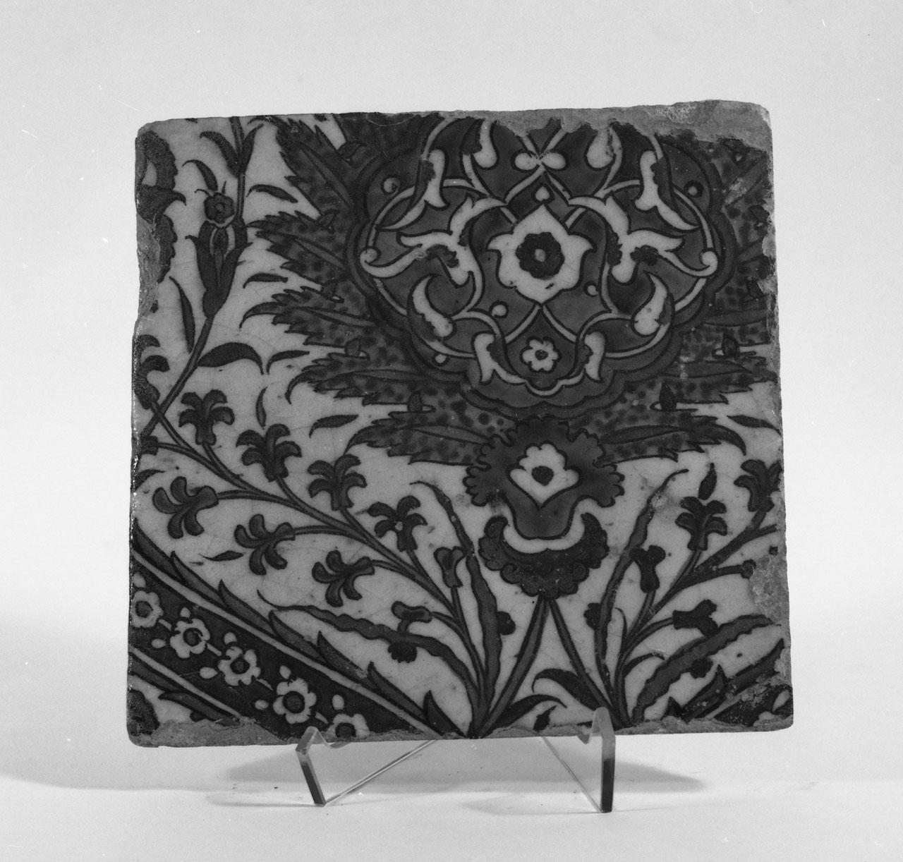 - NOTIZIE STORICO CRITICHE Analogie: A. Lane, A guide to the collection of tiles Victoria & Albert Museum, Londra, 1960, tav. 13, I; C. Ravanelli Guidotti, Donazione Mereghi, M.I.C.F., Bologna, 1987, n. 202, databile al sec. XVII. La composizione evoca con molta affinità modelli tessili, probabilmente anche tappeti. In Lane p. 21: "...le mattonelle del terzo stile di Iznik prodotte dal 155 al 1620 corrispondono alle ceramiche che erroneamente venivano indicate come prodotte sull'isola di Rodi. La loro tecnica è di starordinaria perfezione con colori forse mai uguagliati; da lontano, nella condizione di collocazione normale è il bianco freddo e intenso che si impone più del blu, del turchese, del blu-verde intenso, del rosso e del tratto nero". Il rosso ricco di ossido di ferro (bolo armeno) apprezzato per le sue qualità farmaceutiche non è fusibile e tende a respingere la vetrina per imporre superficie marrone non brillante come succedeva ai ceramisti italiani dello stesso periodo...le composizioni si svolgevano su mattonelle rettangolari di 9 1/2 a 13 inches square