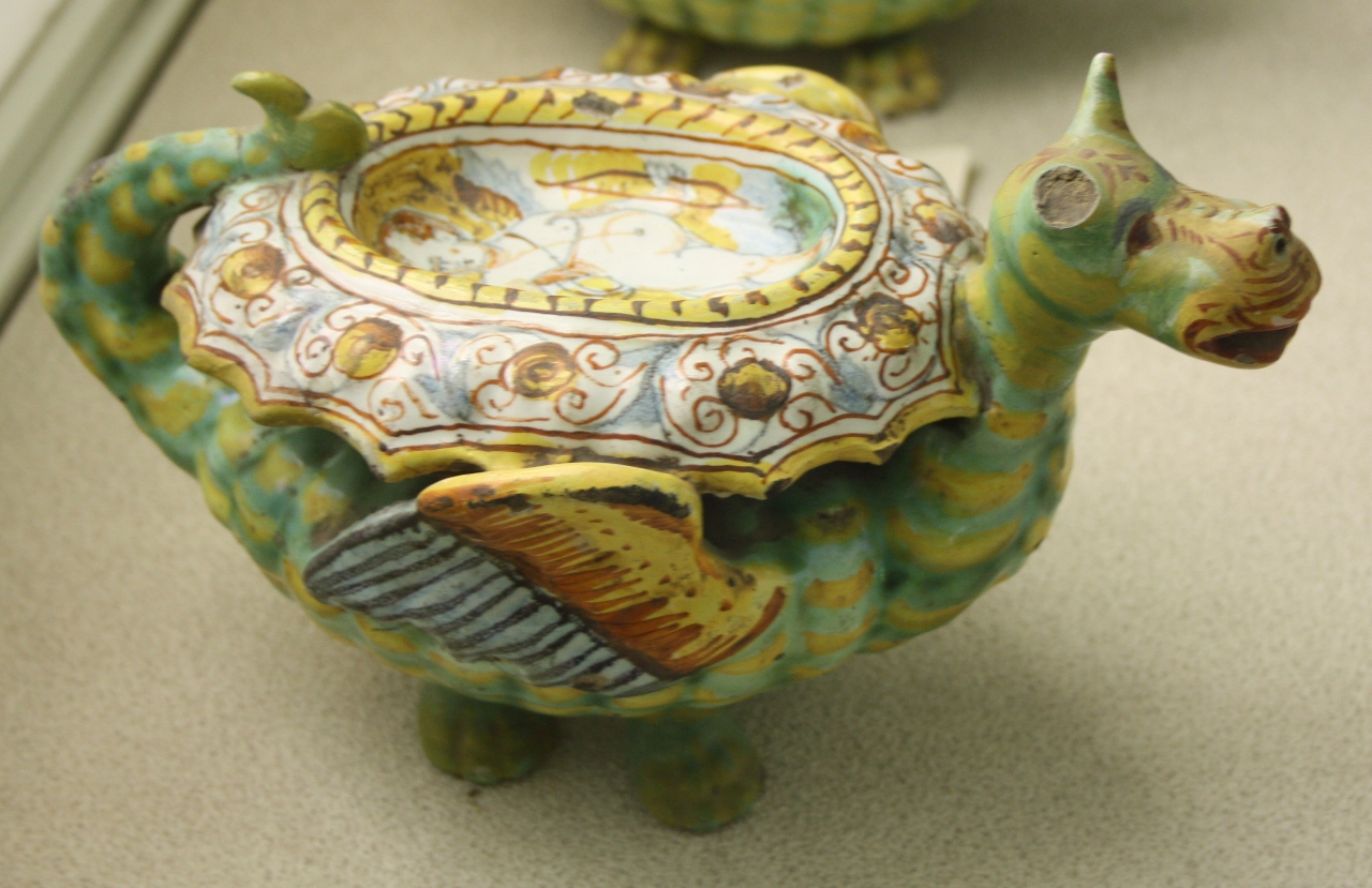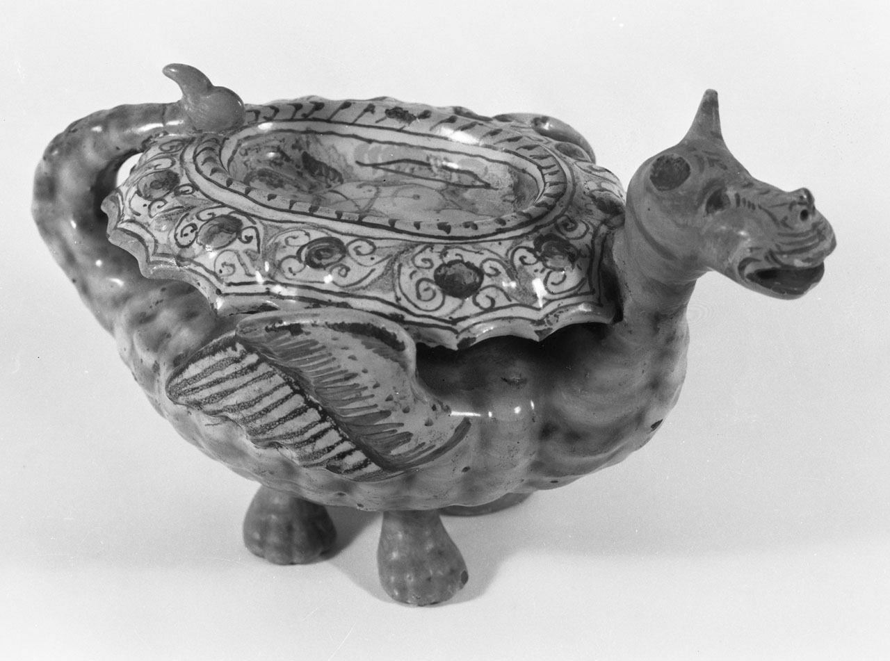 Saliera tetrapode plastica con vaschetta portasale. Corpo ovale baccellato che poggia su quattro zampe; sui lati corti, da un lato vi è il collo e la testa di un drago e, dal lato opposto, la coda biforcuta che fa da manico; sui lati lunghi vi sono le ali spiegate. Colori: giallo, verde, azzurro, nero su smalto bianco