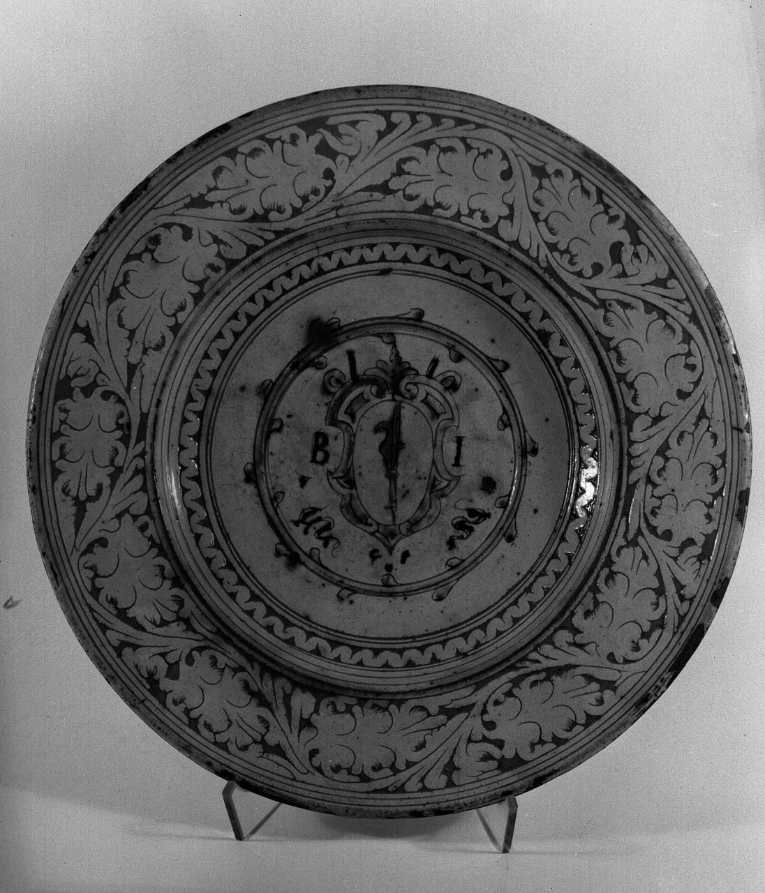 Grande piatto da parata decorato a stecca con stemma centrale della famiglia Ronchi affiancato dalle iniziali B/I in manganese, e disposto entro bastone gemmato circolare di colore verde. Lo stemma accartocciato è in giallo con al centro un roncone in azzurro. Sulla tesa, stelo ondulato che regge nelle curve grandi foglie stilizzate con le punte a pinza di gambero; l'orlo interno è a onda e quello esterno a tratti concentrici; la decorazione a stecca isola i motivi in avorio sul fondo della terra a vista, senza ingobbio. Colori: ingobbio avorio e decorazione in verde, giallo e azzurro