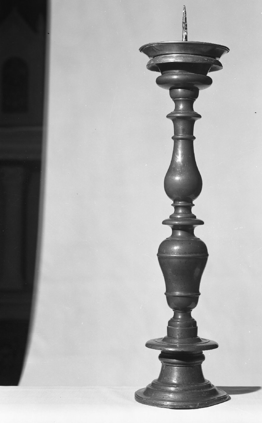 - NOTIZIE STORICO CRITICHE Questo candeliere in bronzo, dalla linea semplice ed elegante, fa parte di una tipologia molto diffusa in Toscana nel corso del XVII secolo ed oltre (cfr. R. C. Proto Pisani, Il museo di arte sacra di San Casciano in Val di Pesa, Firenze 1989, p. 50, fig. 74). E' menzionato nell'inventario della chiesa (A. Gallorini, 1989, p. 4)