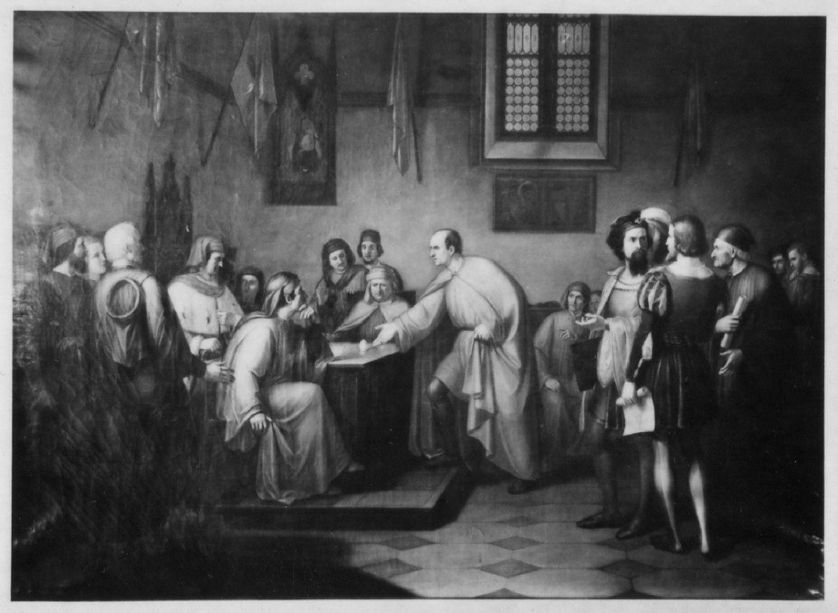 Brunelleschi nell'Uffizio dell'Opera di Santa Maria del Fiore, innanzi ai Consoli, agli operai ed agli Architetti stranieri fa la celebre prova dell'ovo. Brunelleschi schiacchia l'uovo in presenza ai Deputati dell'Opera di S. Maria del Fiore