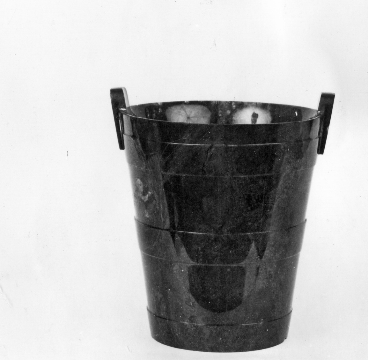 Vaso di diaspro a forma di secchiello. Il corpo è rastremato ed interrotto da tre fasce orizzontali scolpite a rilievo. Il labbro liscio, è interrotto da due piccole prese sopraelevate