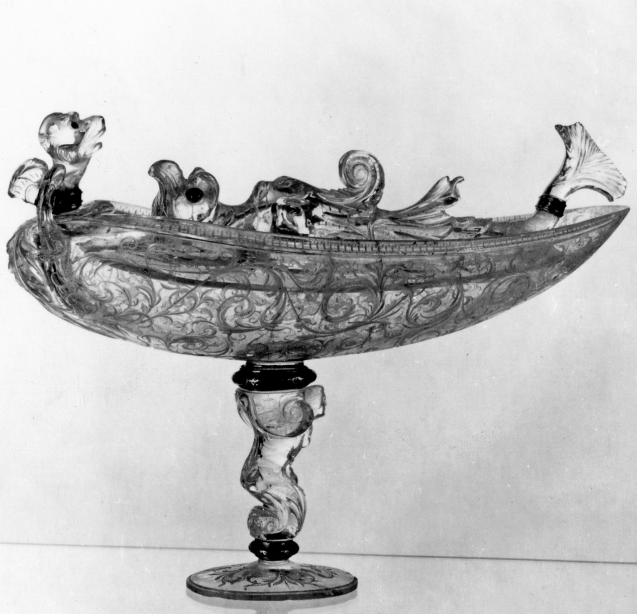 Vaso ricavato in sei pezzi di cristallo di monte. Sul corpo di forma oblunga è collegata una protome di mostro marino, mengre il coperchio è costituito da un pesce scolpito e inciso con pnna congiunta attraverso una fascia d'oro smaltato. Tutto il corpo del vaso è inciso con fitti racemi e volute. IL piedistallo è costiktuito da una sorta di cariatide a tutto tondo, sulle cui spalle poggia il nodo d'oro smaltato che lo collega alla tazza. la base, rotonda, è incisa con motivi a volute