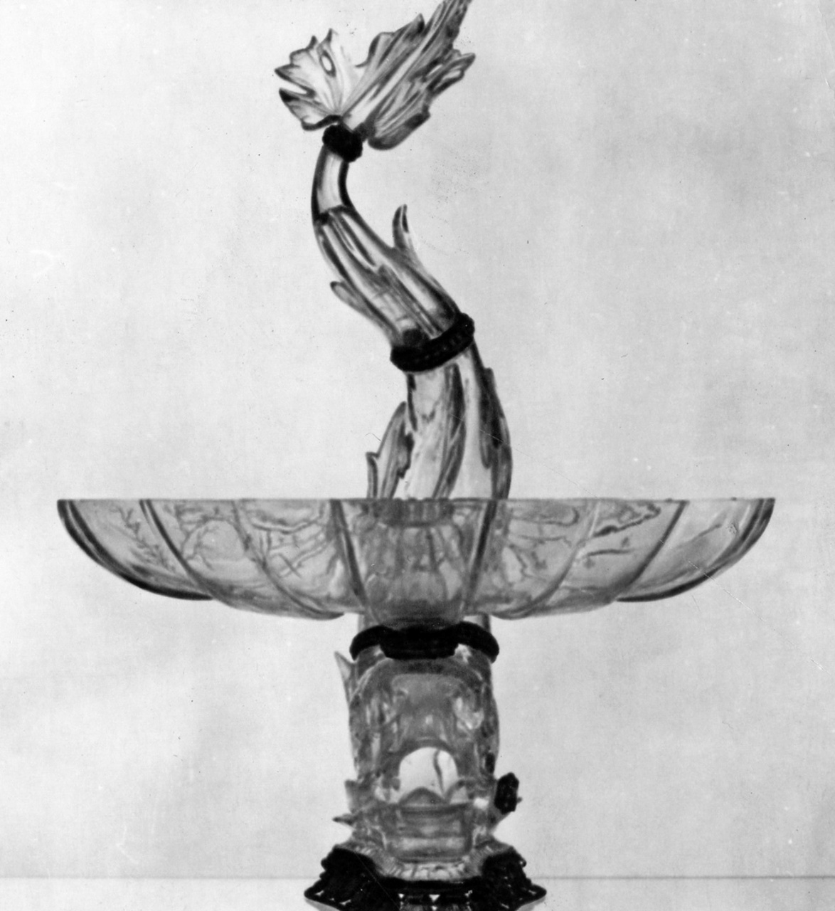 Tazza a forma di nicchia poggiante sulla testa di un delfino, il cui corpo funge da presa. Il delfino è ricavato in quattro pezzi di cristallo congiunti da fasce d'argento decorate da un motivo a perline, e poggia su un piedistallo d'argento ornato da palmette intagliate e cesellate