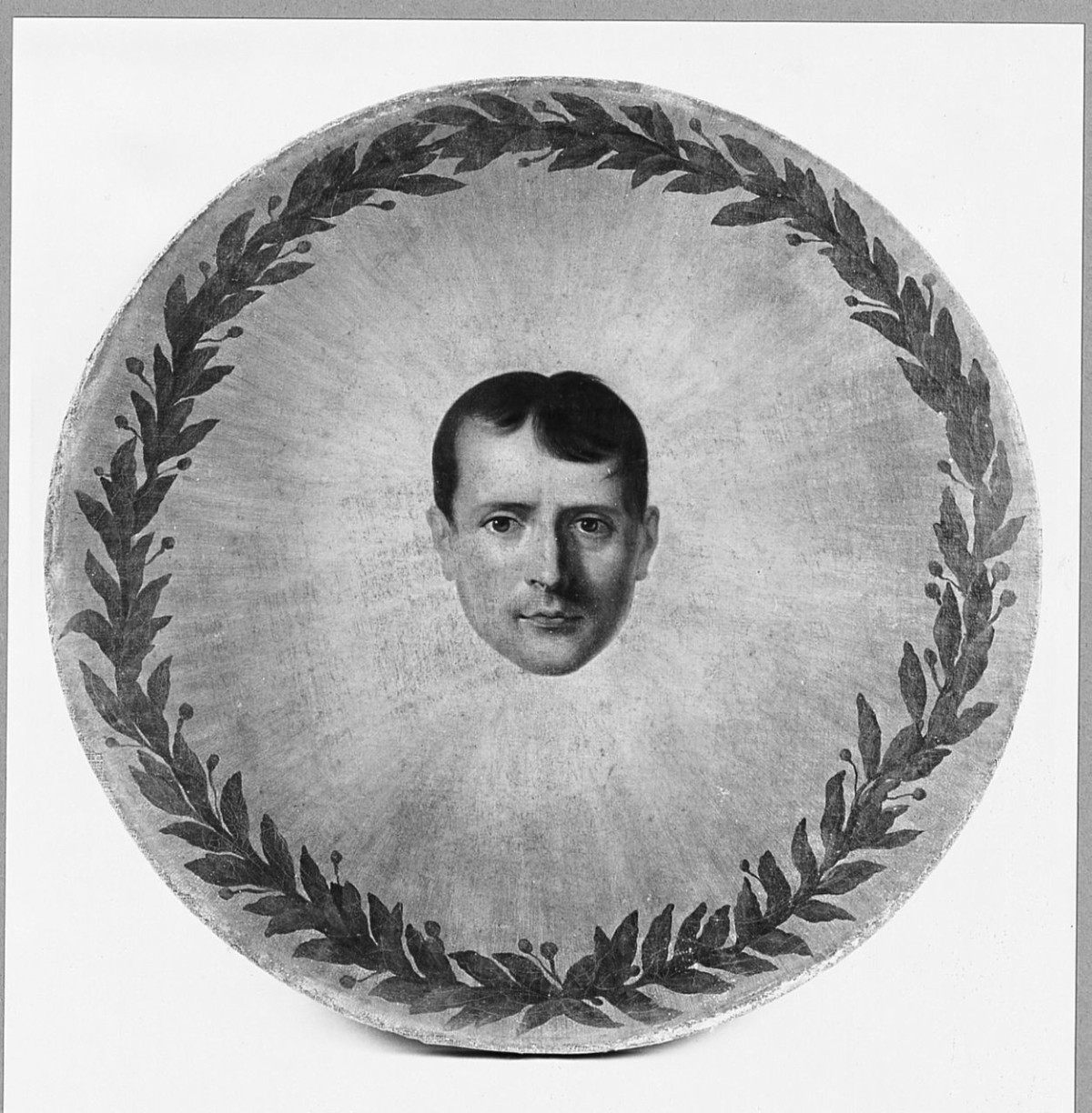 - NOTIZIE STORICO CRITICHE Il dipinto, registrato fin dal 1810 negli inventari della Villa di Poggio Imperiale, venne eseguito probabilmente intorno al 1807, quando cioè Elisa Baciocchi divenne granduchessa di Toscana, come modello per un ricamo o un piano in pietre dure. E' noto infatti come Elisa Baciocchi avesse dato un nuovo impulso alla Galleria dei Lavori commissionando diverse opere in pietre dure sia per adornare la reggia di Pitti che per farne dono al fratello. La ghirlanda d'alloro risulta inoltre stilisticamente vicina a quelle dipinte da Carlo Carlieri per i piani di tavolo poi tradotti in commesso di pietre dure da Giovan Battista Giorgi, mentre il volto di Napoleone, raffigurato come una divinità classica, presenta analogie con le teste, in genere di Giove Capitolino, commesse in piccolo mosaico al centro dei piani dei tavoli prodotti a Roma di cui un esempio è quello conservato nelle sale della Palazzina della Meridiana. Da quanto si rileva dall'Inventario del 1810 la tela era corredata di un "coronamento d'albero scorniciato liscio, intagliato in parte e tutto dorato con arme Borbonica (sic) per da capo"