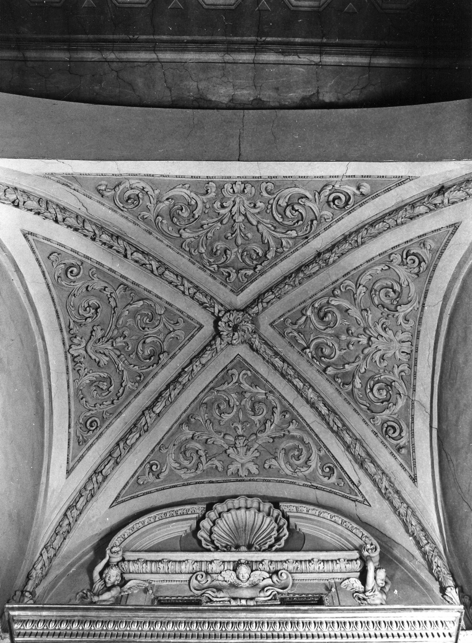 La volta a crociera dell'abside ha le nervature rivestite da una decorazione a stucco, con un ornato a ghirlanda d'alloro intrecciata a nastri; all'incrocio dei costoloni è posto un rosone d'acanto. Le vele della volta sono riempite da racemi d'acanto che si dipartono da un tronco centrale, disponendosi specularmente ad esso