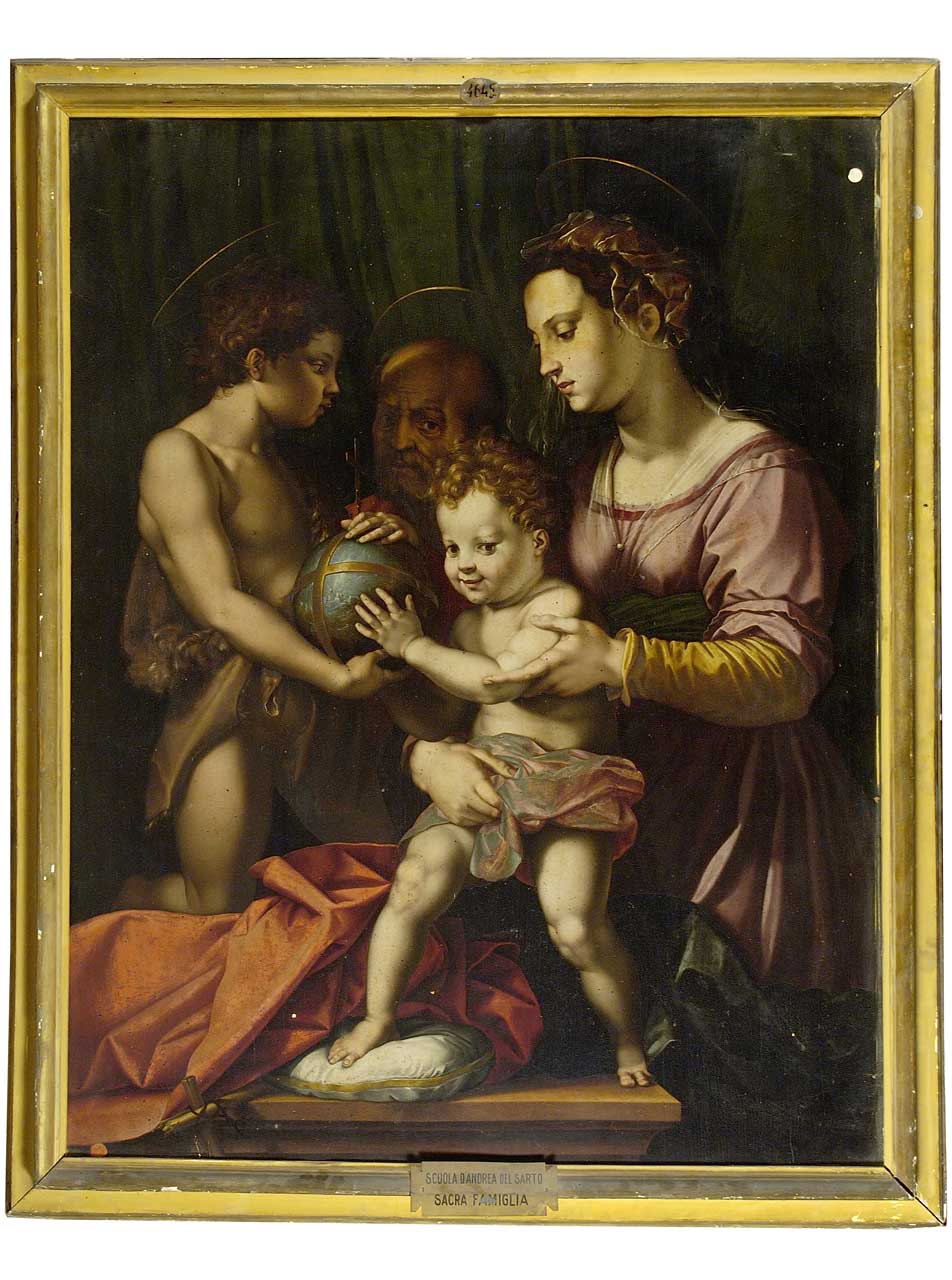 - NOTIZIE STORICO CRITICHE Il dipinto è una copia di alta qualità della Sacra Famiglia Borgherini del Metropolitan Museum di New York (Inv. 22.75), realizzata da Andrea del Sarto entro il 1528. Shearman (1965, p. 277) ritiene il nostro quadro "good quality late Cinquecento copy", nota anche al Di Pietro (1911) e al Freedberg (1963, p. 156). Un'altra copia antica del dipinto americano si trova nella Galleria Corsini di Firenze (cat. 1886, n. 159). Per l'interpretazione del San Giovannino che porge il globo con la croce, simbolo del potere regale, al piccolo Gesù Bambino - continuando però a stringerlo con le mani a simboleggiare che entrambi si rendono protettori della libertà della Repubblica fiorentina - cfr. Natali-Cecchi, 1989, p. 119