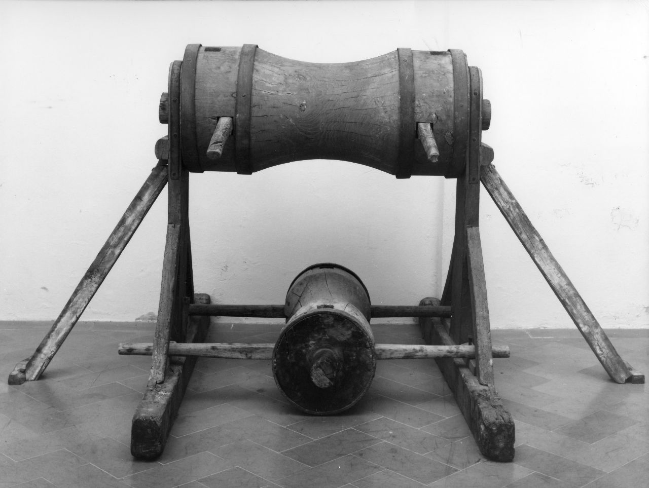 Argano verticale in legno con cerchi di ferro come rinforzo. Poggia su due sostegni laterali in legno ed è formato da un elemento superiore cilindrico con strozzatura centrale e da un corpo inferiore simile al primo posto sotto di esso ma in posizione contrapposta