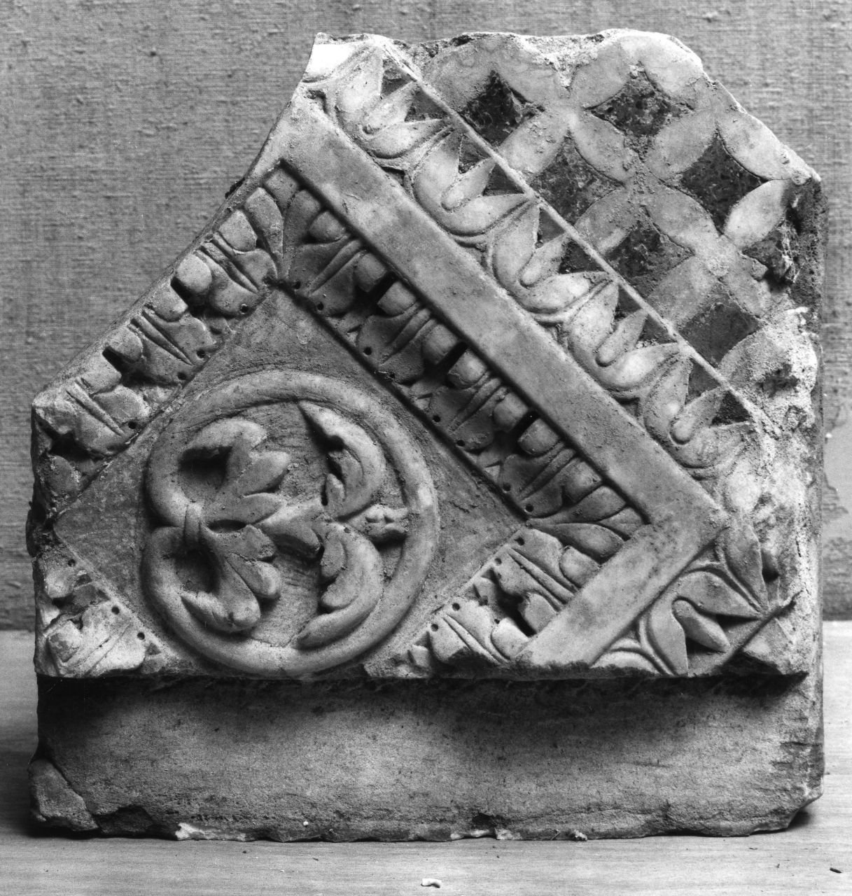 - NOTIZIE STORICO CRITICHE Questa lastra appartiene ad un gruppo di frammenti, caratterizzati tutti dallo stesso tipo di ornato e con marmo nero intarsiato, conservati nel Museo dell'Opera del Duomo, e facenti parte originariamente o dell'antico fonte Battesimale, o del recinto presbiteriale del Battistero di Firenze (cfr. Becherucci-Brunetti; I, 1969, pp. 214-15). L'antico fonte con il recinto furono distrutti dal Buontalenti nel 1577, per l'allestimento dell'apparato per il battesimo di Filippo dei Medici, ed i frammenti furono per lo più riutilizzati come materiale di riempimento nei lavori di restauro del Battistero (Becherucci-Brunetti, 1969). Per primo il Poggi (1910; pp. 73-87) datò i frammenti al primo quarto del Duecento, in base a confronti con opere di quel perioso, come le transenne del coro di San Miniato al Monte. Tale ipotesi venne accettata dal Frey (1911; p. 582). Per Swodoba (1918; p.77), Biehl (1926, tav. 124), Toesca (1927; p. 659), i frammenti apparterrebbero invece al XII secolo. Anthony (1927; pp. 99-111) concorda invece con la datazione proposta dal Poggi, e così anche il Salmi (1914, p. 375 e 1928, p.54) che pensa che il fonte sia stato eseguito al tempo degli importanti rinnovamenti nel Battistero, negli anni 1202-1225, e ne sottolinea l'analogia, ma anche l'arcaicità maggiore rispetto a quelli in San Miniato al Monte. Per Becherucci e Brunetti (1969), essi sarebbero frutto della diffusione in Toscana dei modi decorativi sviluppatisi soprattutto a Pisa, con Guglielmo, e poi a Lucca e caratterizzati da questo tipo di ornato e dall'uso di marmi bianchi e neri. Questo frammento, mai pubblicato, è stato ritrovato, secondo la didascalia che ne accompagna l'esposizione, nel 1985 alla base del pilastro sinistro della Porta nord del Battistero