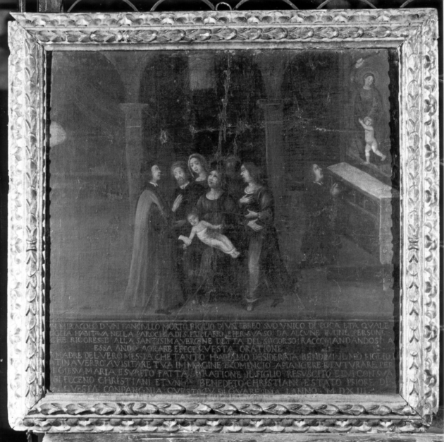 • ISCRIZIONI in basso - UN MIRACOLO DI UN FANCIULLO MORTO FIGLIO DI UN EBREO SUO UNICO DI POCA ETA QUALE/ FAMIGLIA HABITAVA NELLA PAROCHIA DI S. FREDIANO E PERSUASO DA ALCUNE BUONE PERSONE/ CHE RICORRRESSE ALLA SANTISSIMA VERGINE DETTA DEL SOCCORSO RACCOMANDANDOSI A/ ESSA ANDO' A ORARE E FECE QUESTA ORATIONE/ A MADRE DEL VERO MESSIA CHE TANTO HAMIAMO DESIDERATA RENDIMI IL MIO FIGLIO/ LA MATINA VERRO A VISITARE LA TUA IMMAGINE E COMINCIO A PIANGERE ET UTURARE PER/ LI GIESU MARIA E SUBITO FATTA ORATIONE IL FIGLIO RESUSCITO E IVI CON SUA/ SI FECENO CHRISTIANI ET UN BENEDETO CHRISTIANI E STATO PRIORE DI/ QUESTA COMPAGNIA DUESTO DI QUARESIMA L'ANNO MDXIII - lettere capitali -