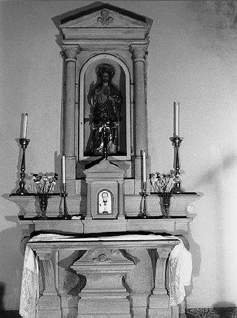 Paliotto a forma di sarcofago, mensole a voluta, tabernacolo con colonnine e timpano triangolare, dossale con colonne sorreggenti frontone triangolare